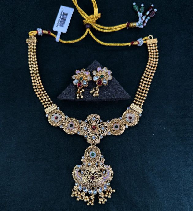 This stunning necklace set is designed with intricate gold detailing and features peacock motifs adorned with colorful gemstones, creating a regal and timeless look. The necklace is paired with matching floral earrings that complement the design with multicolored stones. The rich craftsmanship, combining traditional motifs and vibrant accents, makes this set ideal for weddings, festivals, or other special occasions where you want to make a statement.