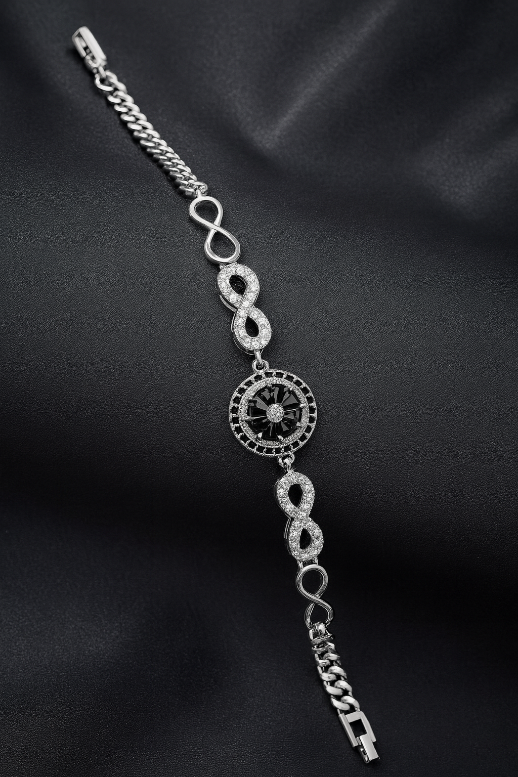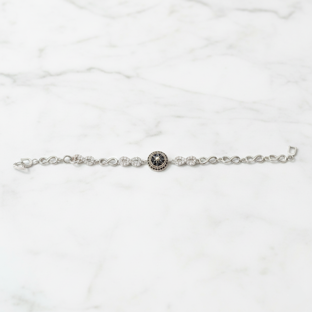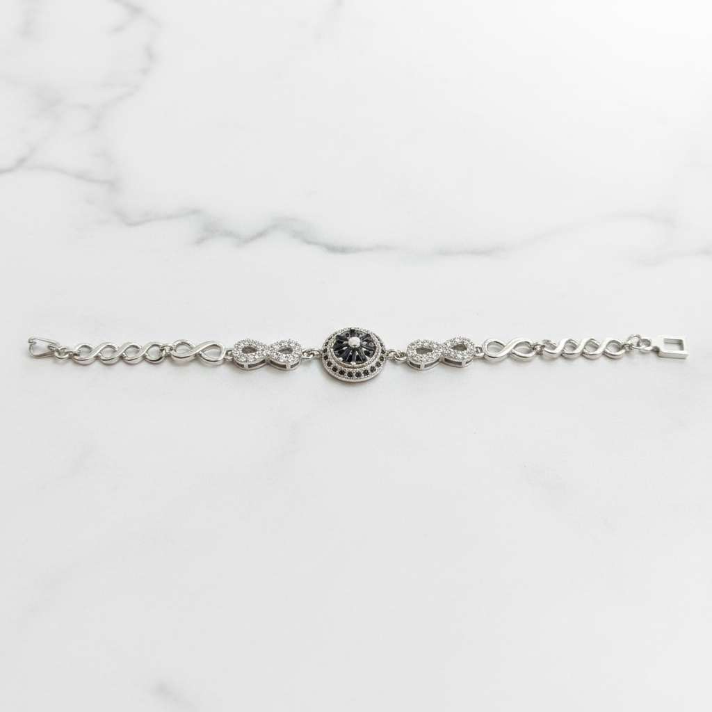 The Infinity Noir Spark Bracelet blends timeless elegance with a modern twist. Designed with alternating infinity links and a striking black central stone, it brings a touch of sophistication to every look. The shimmering CZ detailing enhances its luxurious appeal, making it ideal for evening wear or premium gifting. Lightweight, durable, and flawlessly finished — this bracelet is a statement of endless style.