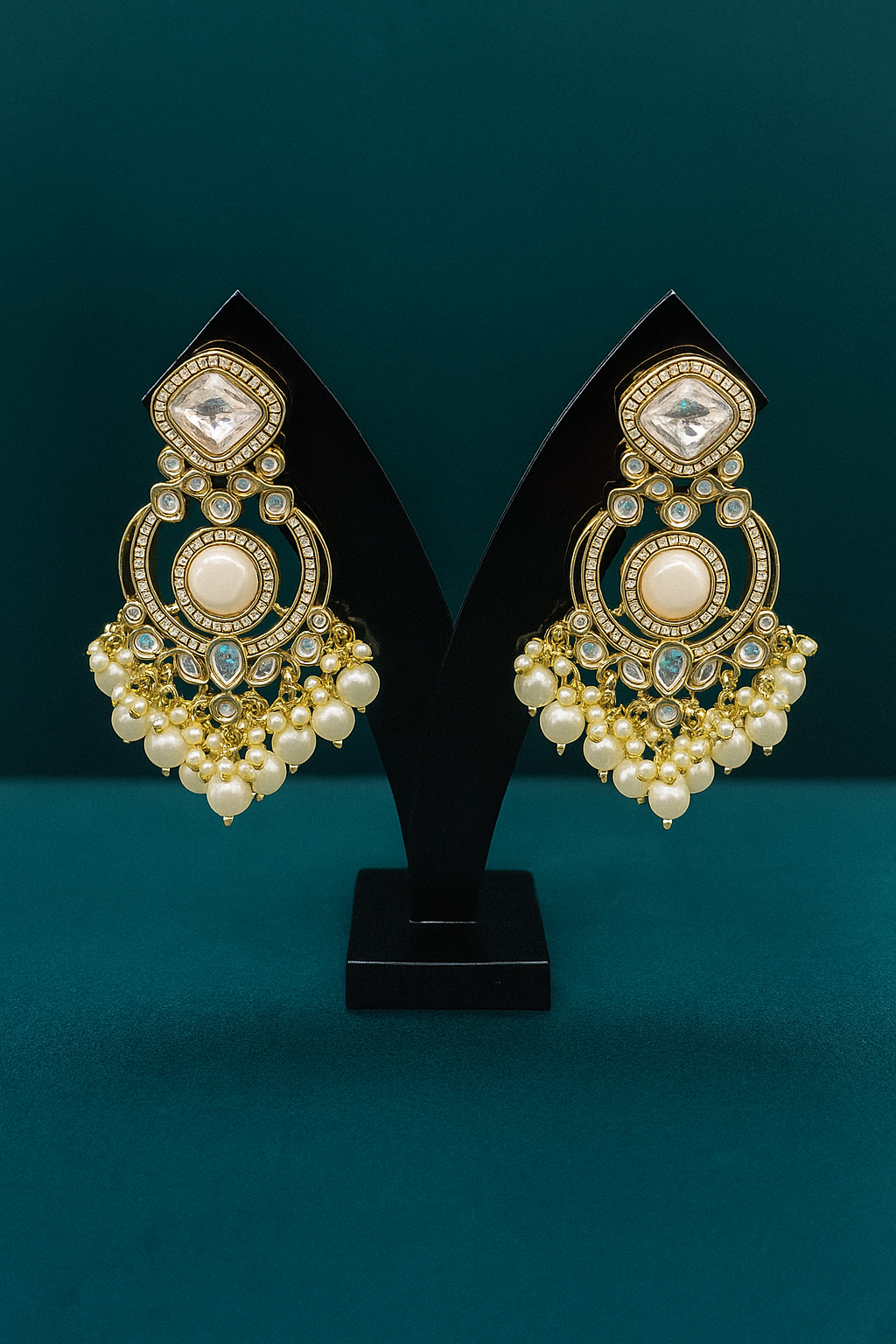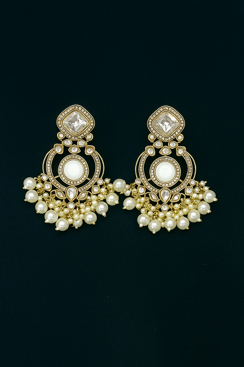 The Ivory Regal Kundan Circle Earrings showcase a timeless blend of classic pearls and intricate kundan artistry. Designed with layered circular motifs, these earrings feature sparkling cut-glass stones and soft ivory centers that create a rich, royal appeal. The pearl clusters add graceful movement, making them perfect for weddings, festivals, and sophisticated occasions. Lightweight yet grand, they elevate both traditional and Indo-western outfits effortlessly.