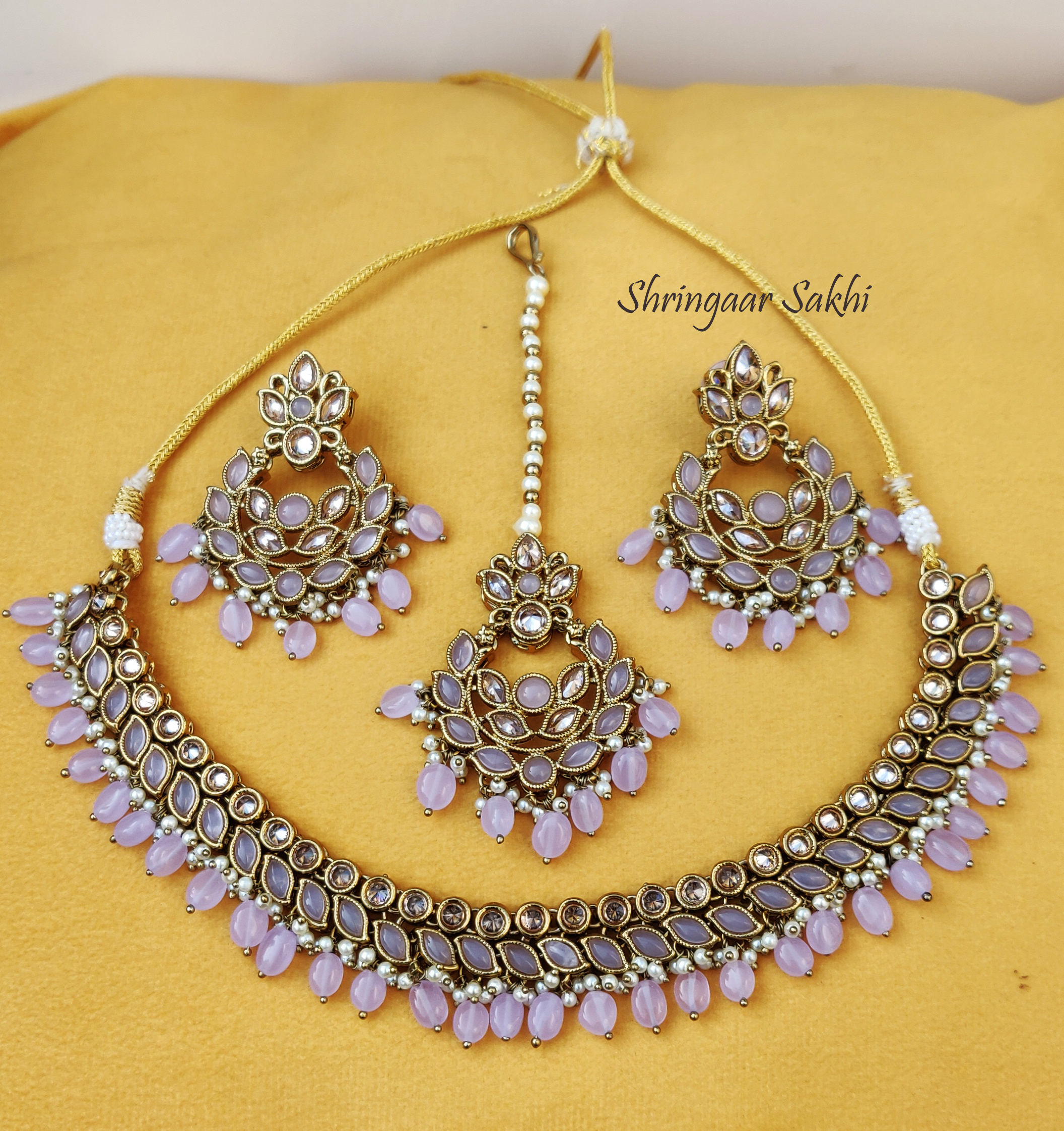 This is a Kundan golden combo set: a harmonious blend of tradition and contemporary allure. With a captivating choker, intricate earrings, and delicate mangtikka, adorned with enchanting Lavender stone work, this ensemble exudes elegance.