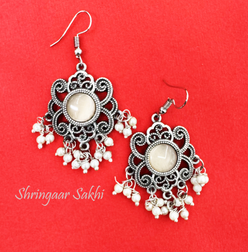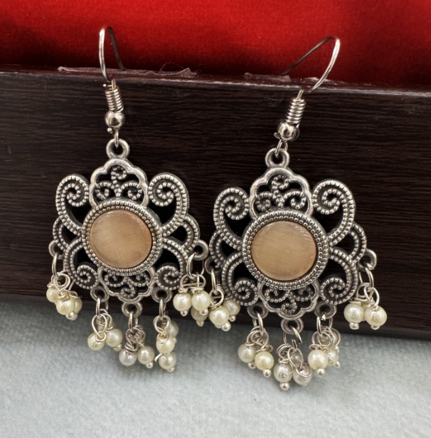 These earrings feature a beautiful light brown stone set in a traditional silver frame with intricate filigree work. The danglers adorned with small pearls add a playful movement, making them perfect for an ethnic or bohemian look.