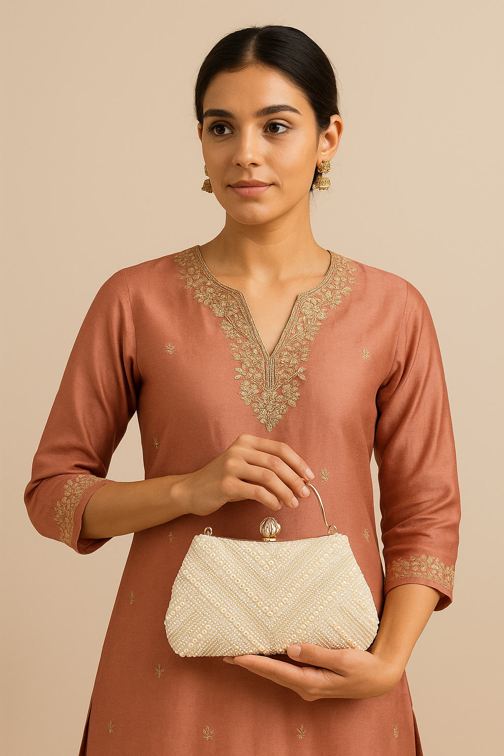 Pair this pearl clutch with pastel or gold-toned ethnic wear like sarees, lehengas, or anarkalis for an elegant festive look. It also complements Indo-western gowns and party outfits beautifully. Add pearl or gold jewelry to create a coordinated, luxurious finish.