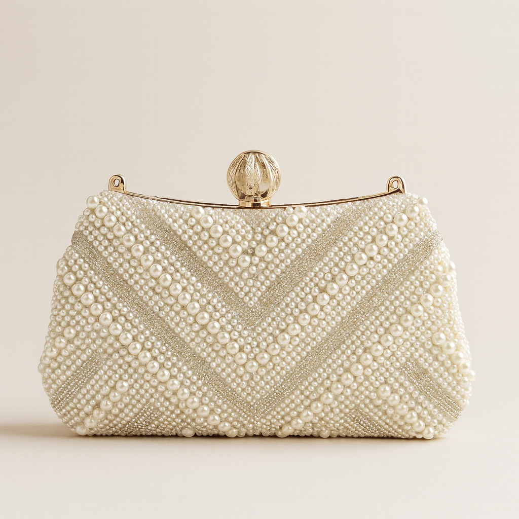 This luxurious pearl-embellished clutch is designed to bring sophistication and timeless charm to your festive wardrobe. Featuring a beautifully handcrafted chevron pattern made with high-quality pearls and crystal beads, it catches the light with every movement, creating a soft, elegant sparkle. this clutch blends seamlessly with both traditional and modern outfits. A truly versatile accessory that elevates any look with effortless grace.