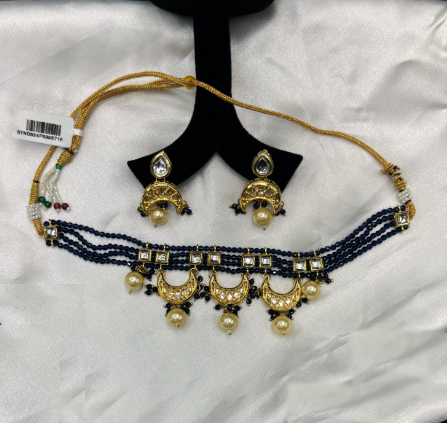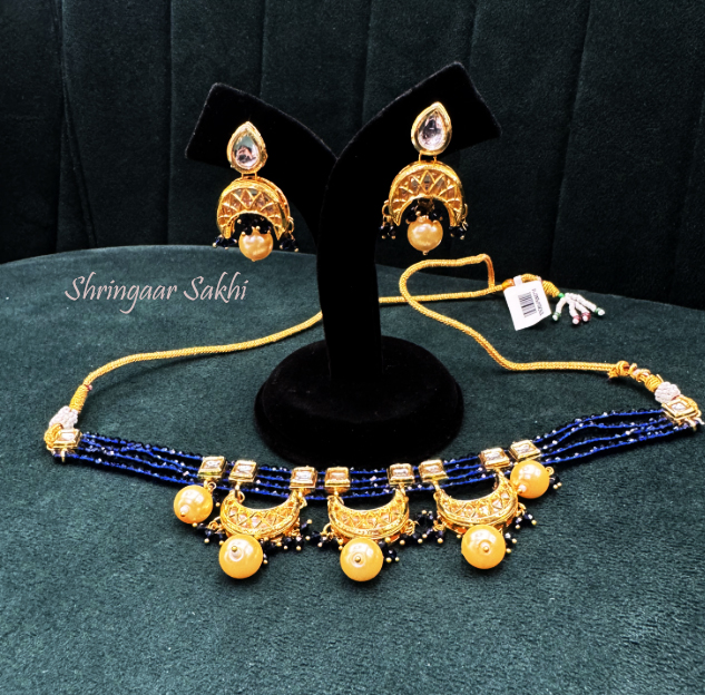 This beautiful choker necklace set features rich blue beads intricately woven with golden crescent moon-shaped pendants, adorned with kundan work and elegant pearl drops. The matching earrings, designed with similar crescent detailing and pearl accents, perfectly complement the bold look of the necklace. This set is ideal for festive occasions, weddings, or traditional events, offering a blend of opulence and grace to elevate any ethnic ensemble.