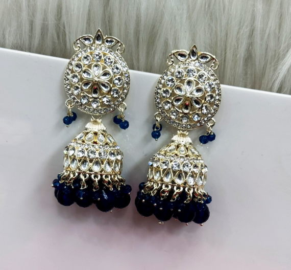 For styling, pair these jhumkas with a classic saree or lehenga in royal hues like deep blue, silver, or even black for a rich contrast. The earrings are bold enough to serve as a statement piece, so keep other accessories minimal to let the jhumkas stand out. You can also wear them with a modern outfit like an embroidered gown or anarkali, especially for evening events where the sparkle of the stones and the blue accents will truly shine.