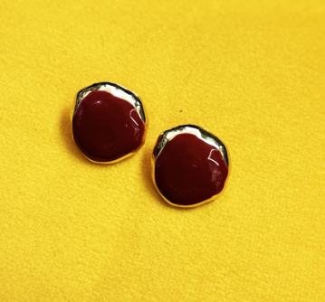 These minimal yet bold stud earrings feature an organic, irregular shape with a glossy maroon enamel finish, bordered by a subtle gold-toned rim. Their unique handcrafted appearance and rich color add a touch of modern artistry while maintaining simplicity. Lightweight and versatile, they are perfect for adding a pop of color to your everyday outfits or elevating your casual looks with a stylish edge.