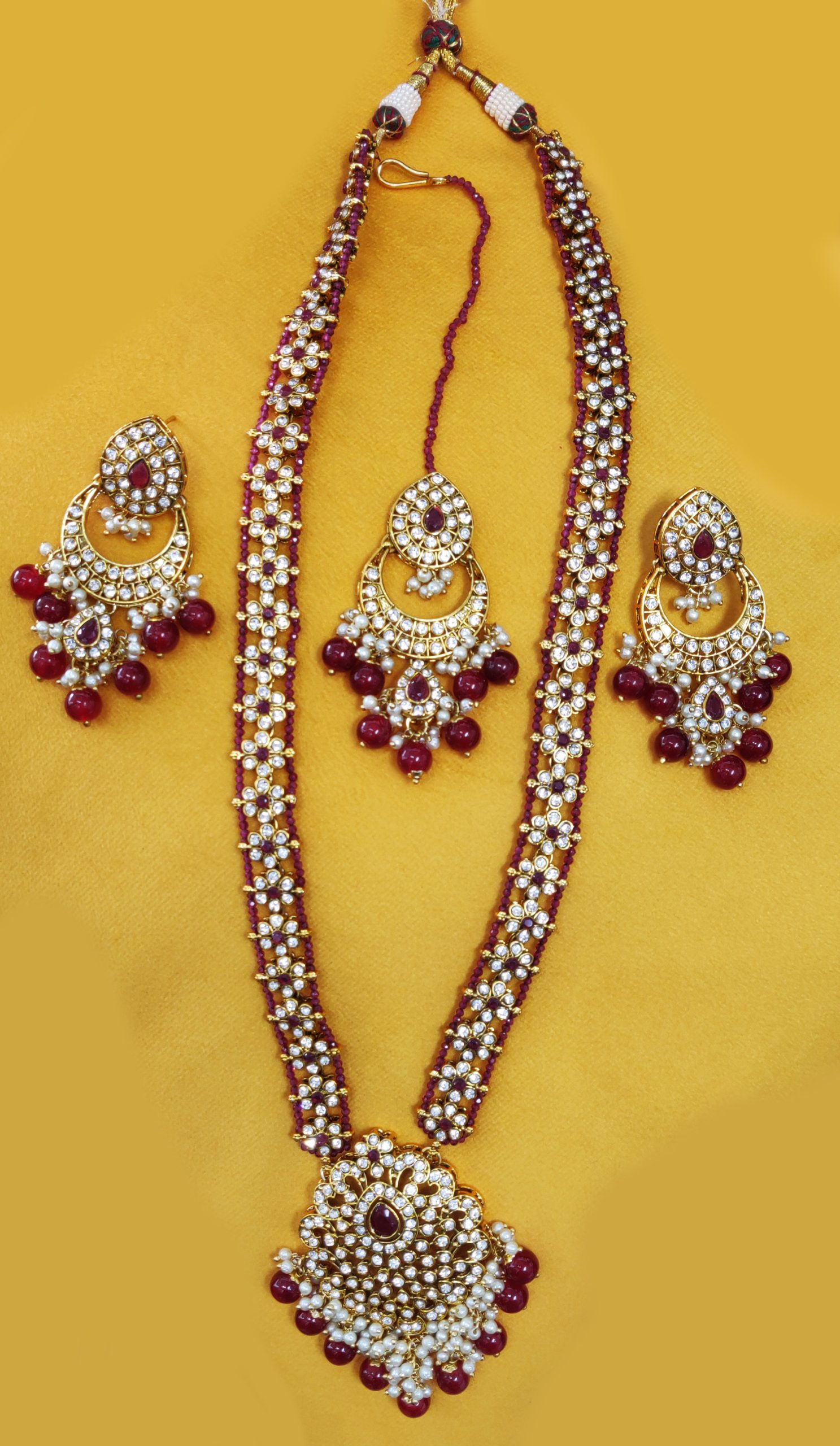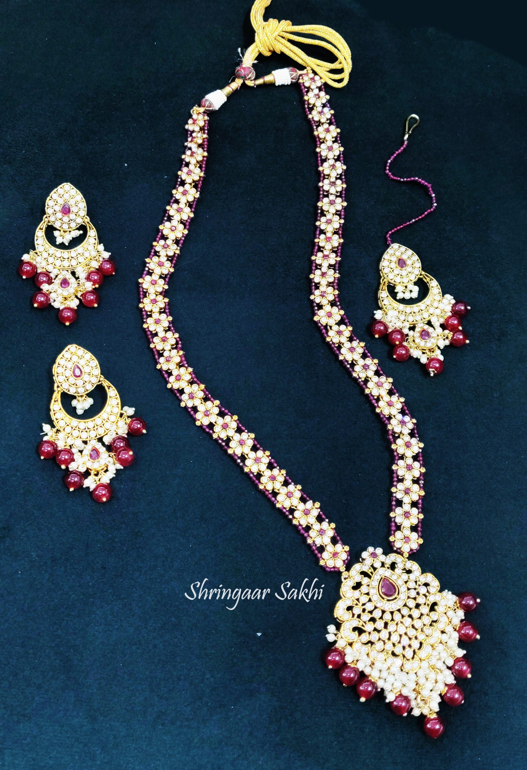 A stunning maroon long AD set, including matching earrings and a maang tikka, radiates traditional elegance. The necklace showcases intricate craftsmanship with maroon stones and beads, while the earrings and maang tikka complete the look with a harmonious touch. Perfect for special occasions, this ensemble beautifully combines tradition and contemporary sophistication.