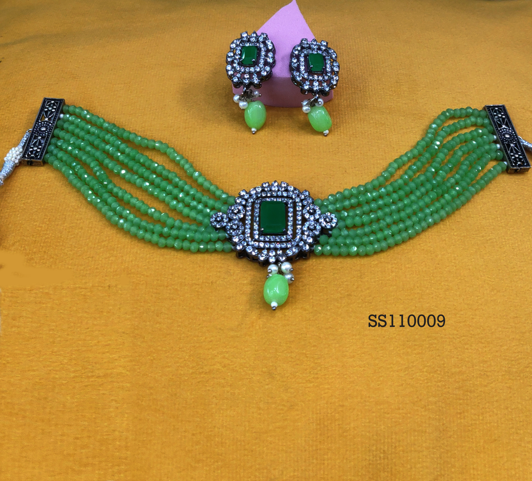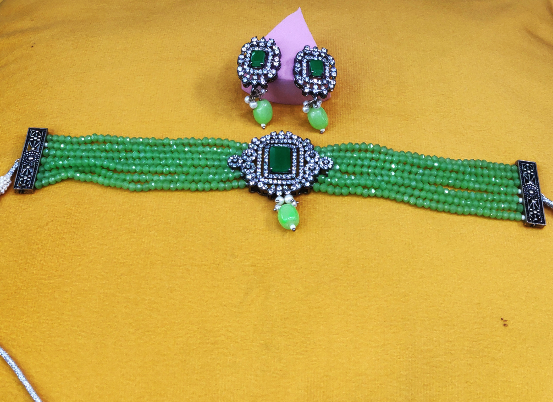 This elegant choker set showcases a luxurious arrangement of rich green beads paired with antique silver-toned settings, exuding a classic yet royal charm. The necklace features multiple strands of glossy green beads that converge at a bold square centerpiece, adorned with a striking green stone surrounded by sparkling American diamonds. A soft green bead drop adds a graceful finish to the focal pendant. The matching earrings mirror the same design with central green stones framed by American diamonds and finished with delicate green bead drops.