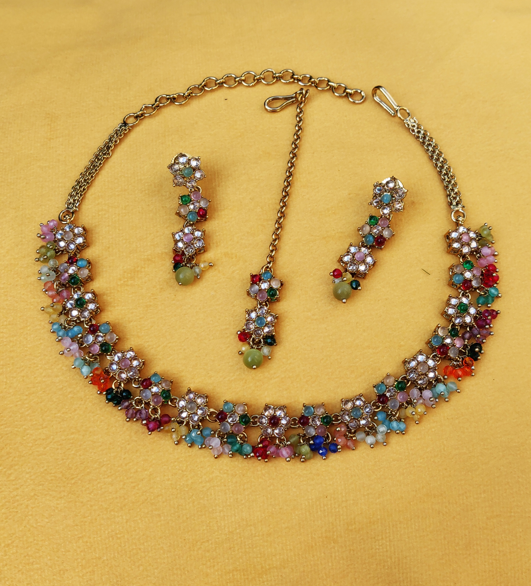 This combo set is a harmonious blend of classic charm and contemporary allure. This set comprises a captivating choker, exquisite earrings, and a delicate mangtikka, adorned with elegant multicolor pearl drops and intricate multicolor stones in delicate floral designs.