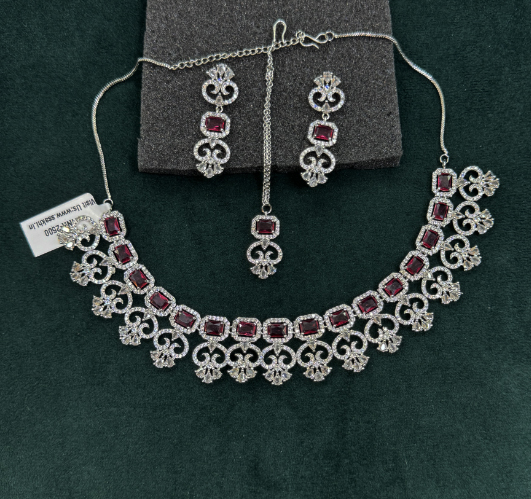 This elegant necklace set features a delicate design with deep red square-cut stones framed by intricate silver work and sparkling accents. The necklace is beautifully complemented by matching earrings and a maang tikka, making it a perfect choice for formal occasions or traditional events. The combination of the rich red stones and silver detailing offers a refined and luxurious look, ideal for brides or anyone seeking to add a touch of glamour to their attire.