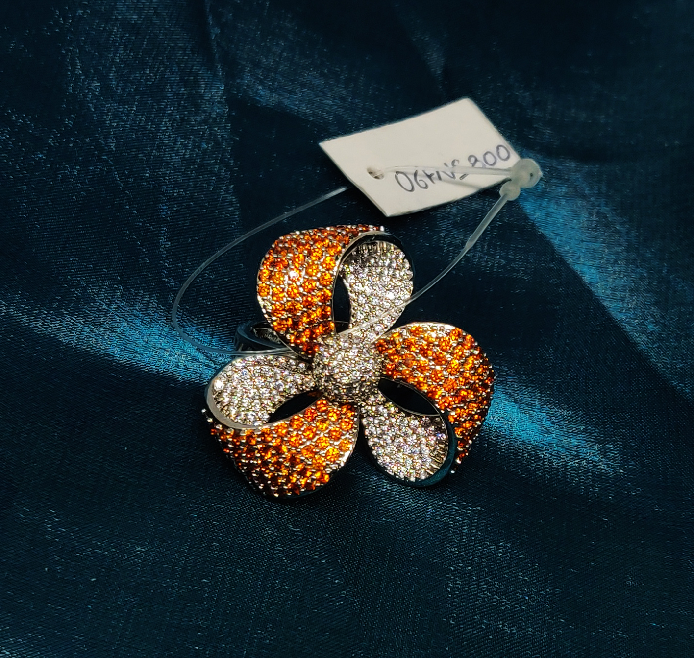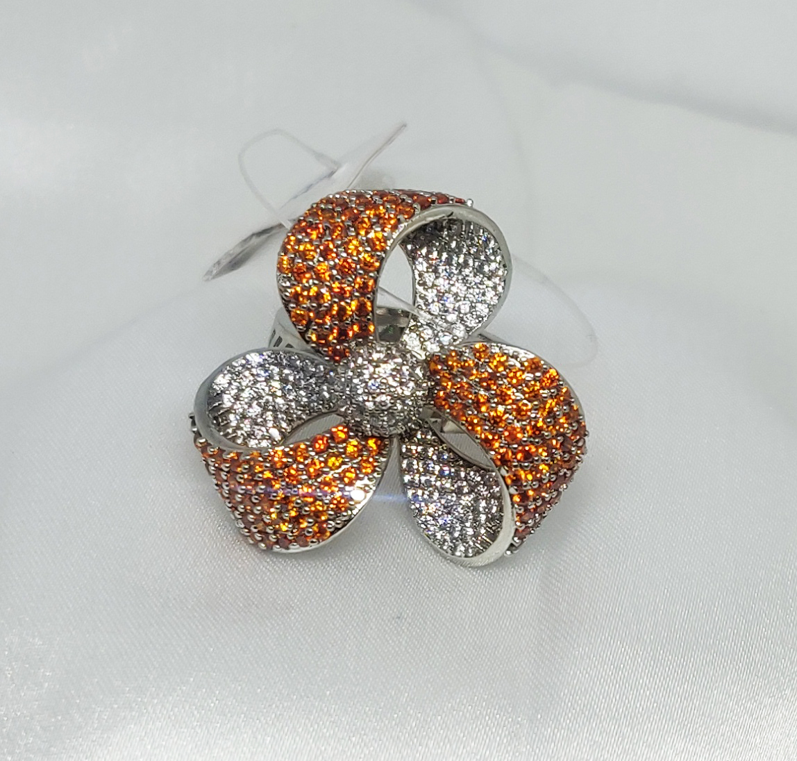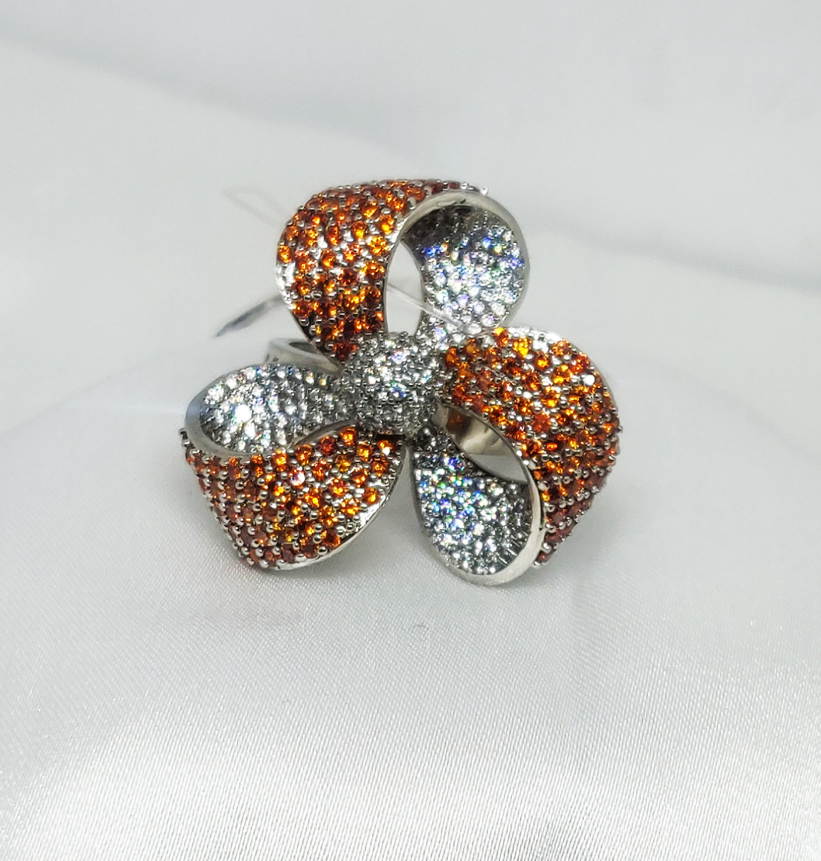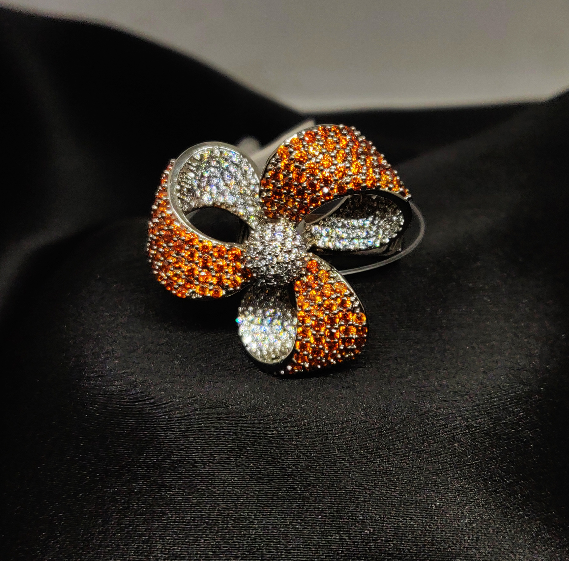 This exquisite bow-shaped finger ring is a true statement piece, featuring a striking combination of orange and white stones set on a lustrous silver-toned band. The intricate pave setting gives it a rich, textured finish, while the elegant bow design adds a whimsical yet luxurious touch. Ideal for those who love bold, glamorous accessories with a playful twist, this ring captures attention effortlessly.