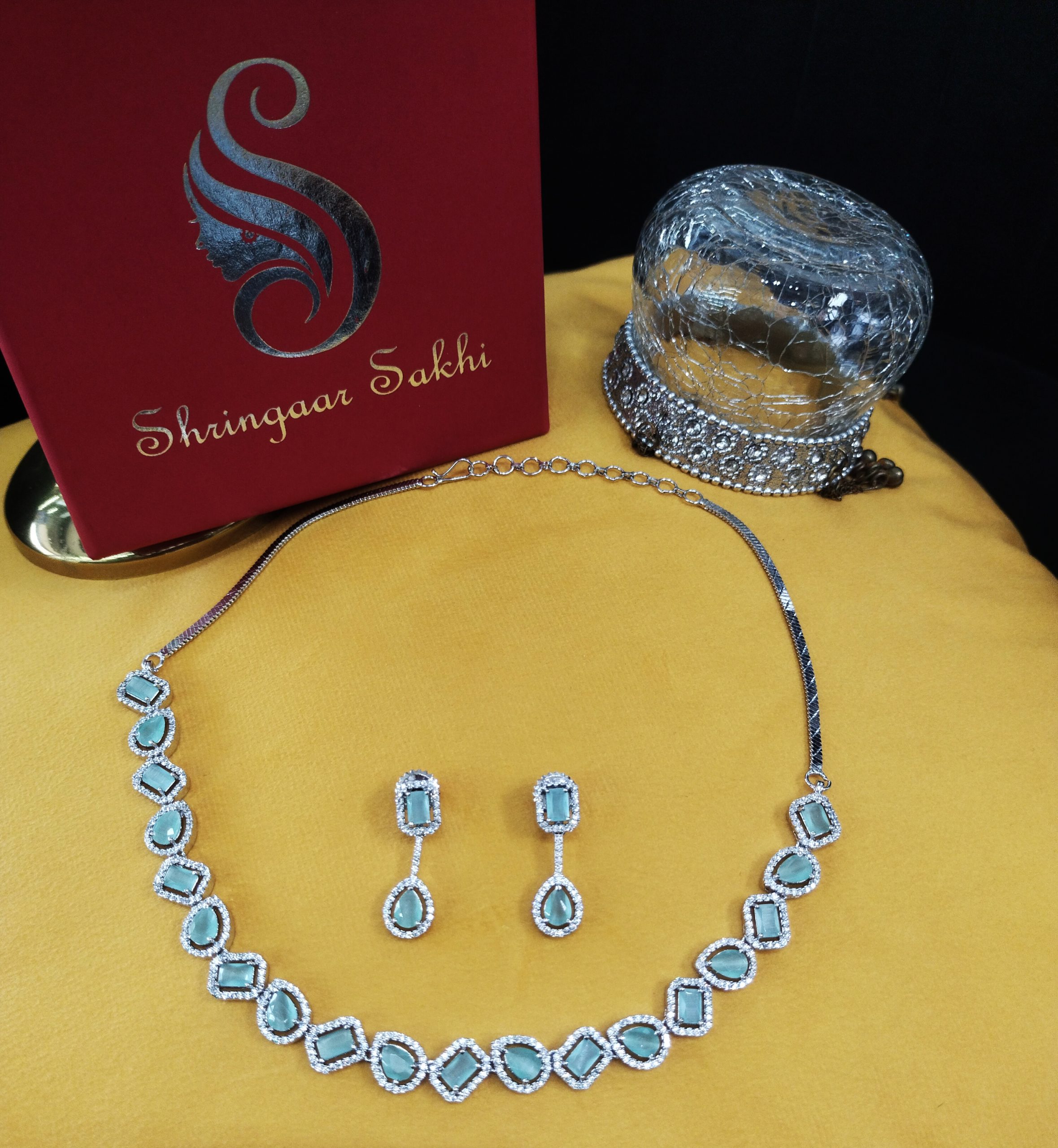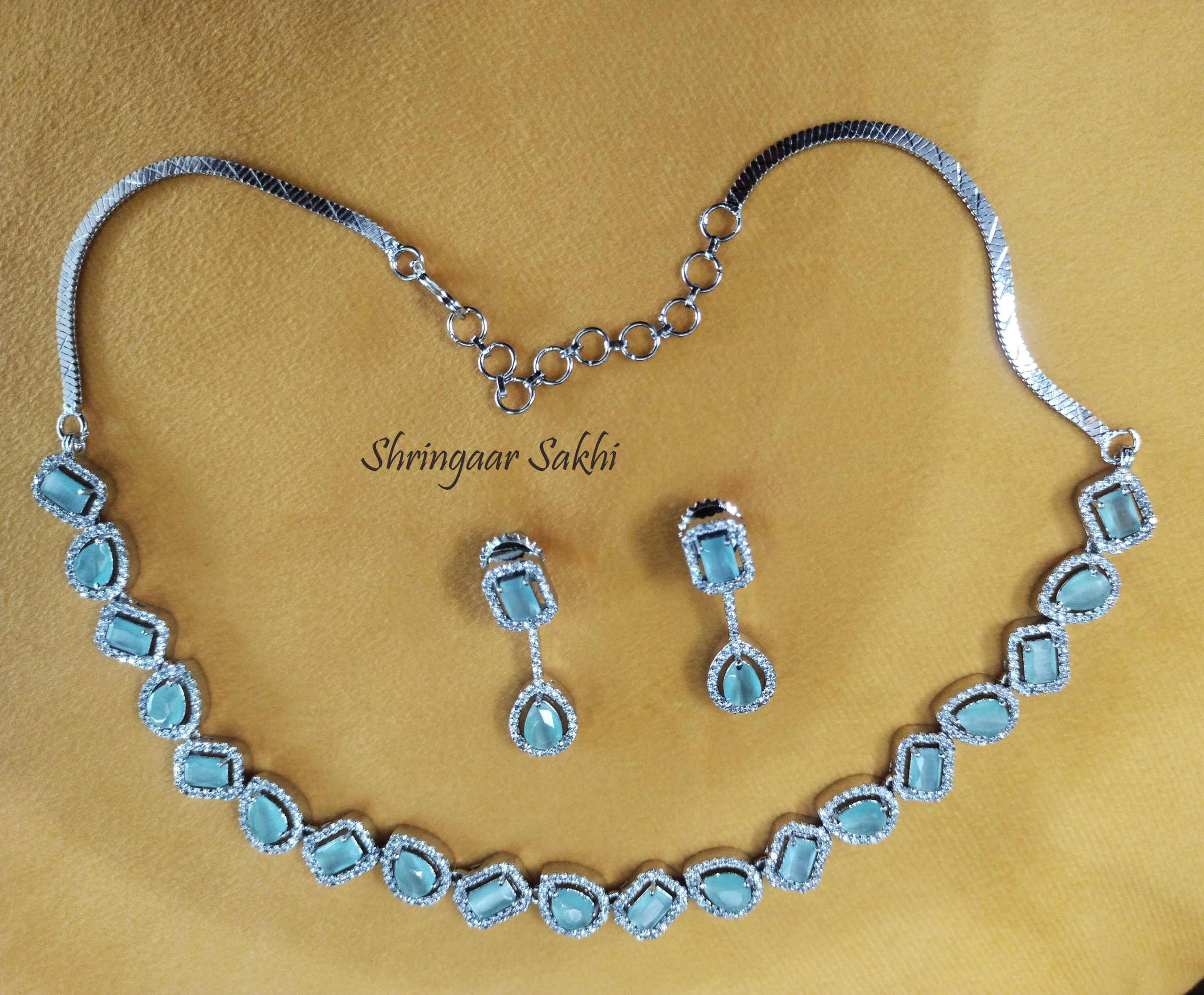 The necklace is silver-plated with pastel green color stones work secured with S-hook closure comes with a pair of matching drop earrings, secured with a post-and-back closure.