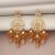 These stunning earrings feature a detailed combination of intricate gold work and white stones, balanced with pearl drops that exude timeless elegance. The design follows a geometric pattern with a central stone surrounded by floral motifs, creating a blend of traditional and modern aesthetics. The dangling beads in warm hues add depth and movement to the piece, making it perfect for festive or bridal occasions.