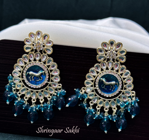 These stunning earrings feature a captivating design centered around a delicate horse motif in peacock green, surrounded by a halo of teardrop-shaped stones. The floral element at the top adds a touch of femininity, while the hanging teal-green beads provide movement and an eye-catching pop of color. The intricate craftsmanship and detailing make these earrings perfect for adding a regal touch to any outfit.