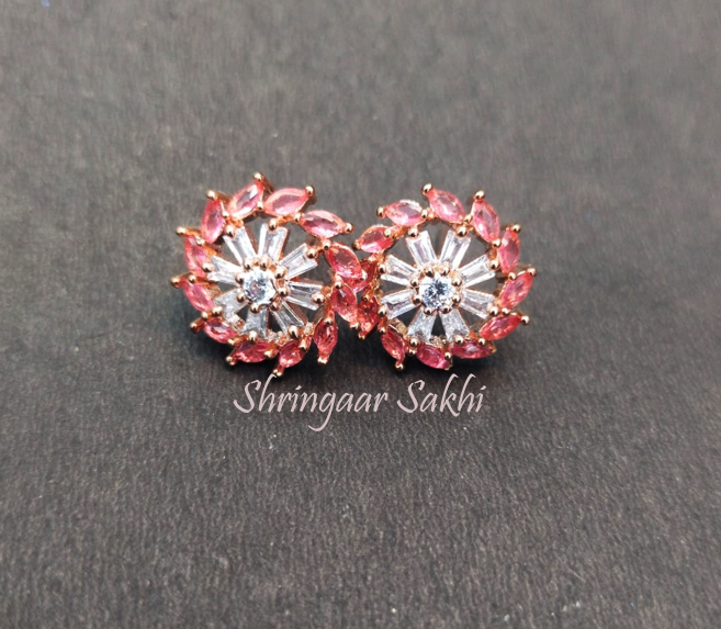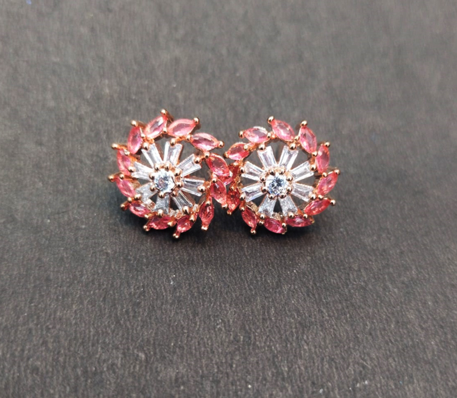 These dazzling earrings feature a beautiful circular design, with sparkling pink marquise-cut stones surrounding a central cluster of clear baguette-cut crystals. The combination of vibrant pink and shimmering clear stones creates an eye-catching contrast, set in a gold-toned base that adds a luxurious feel.