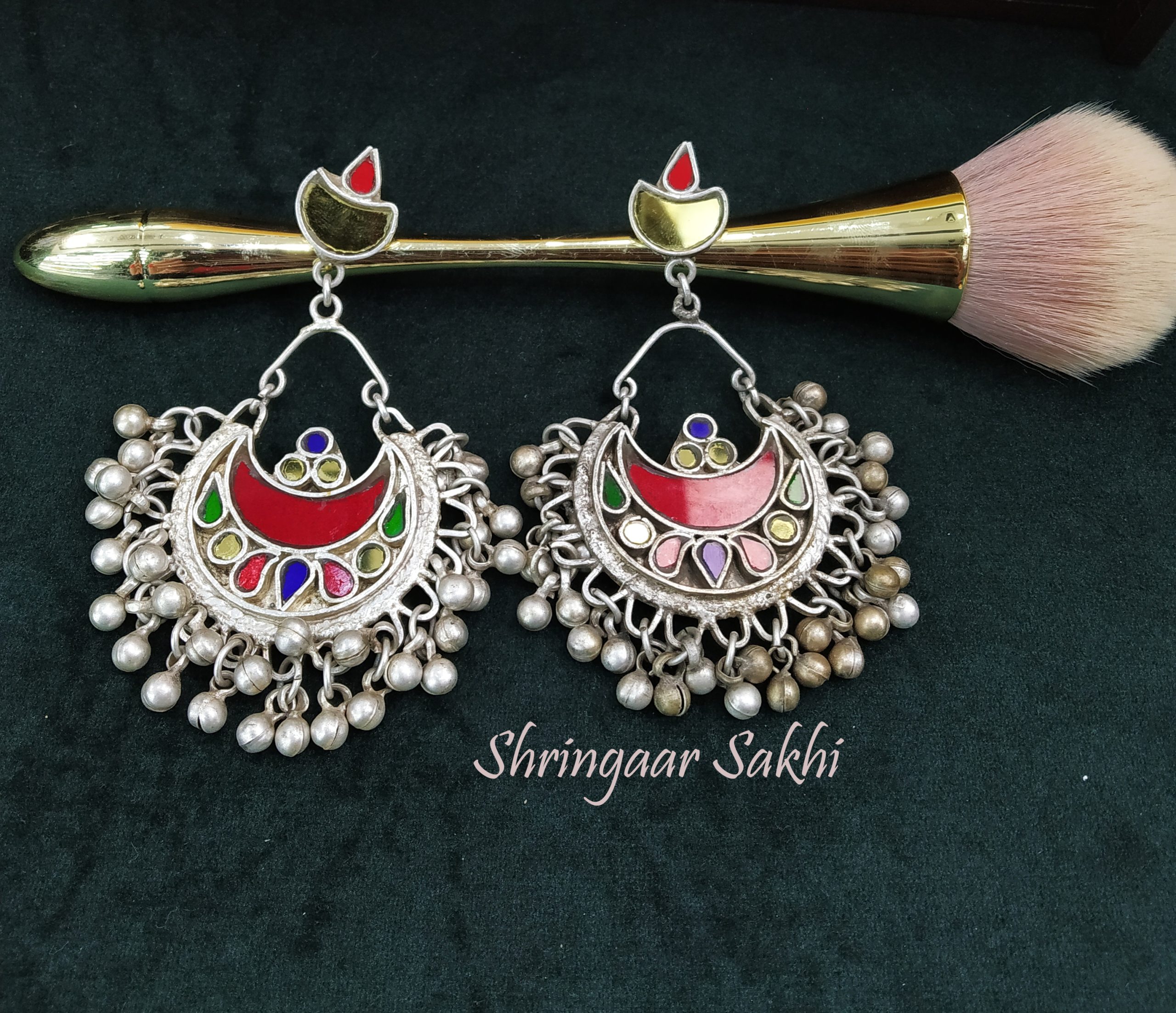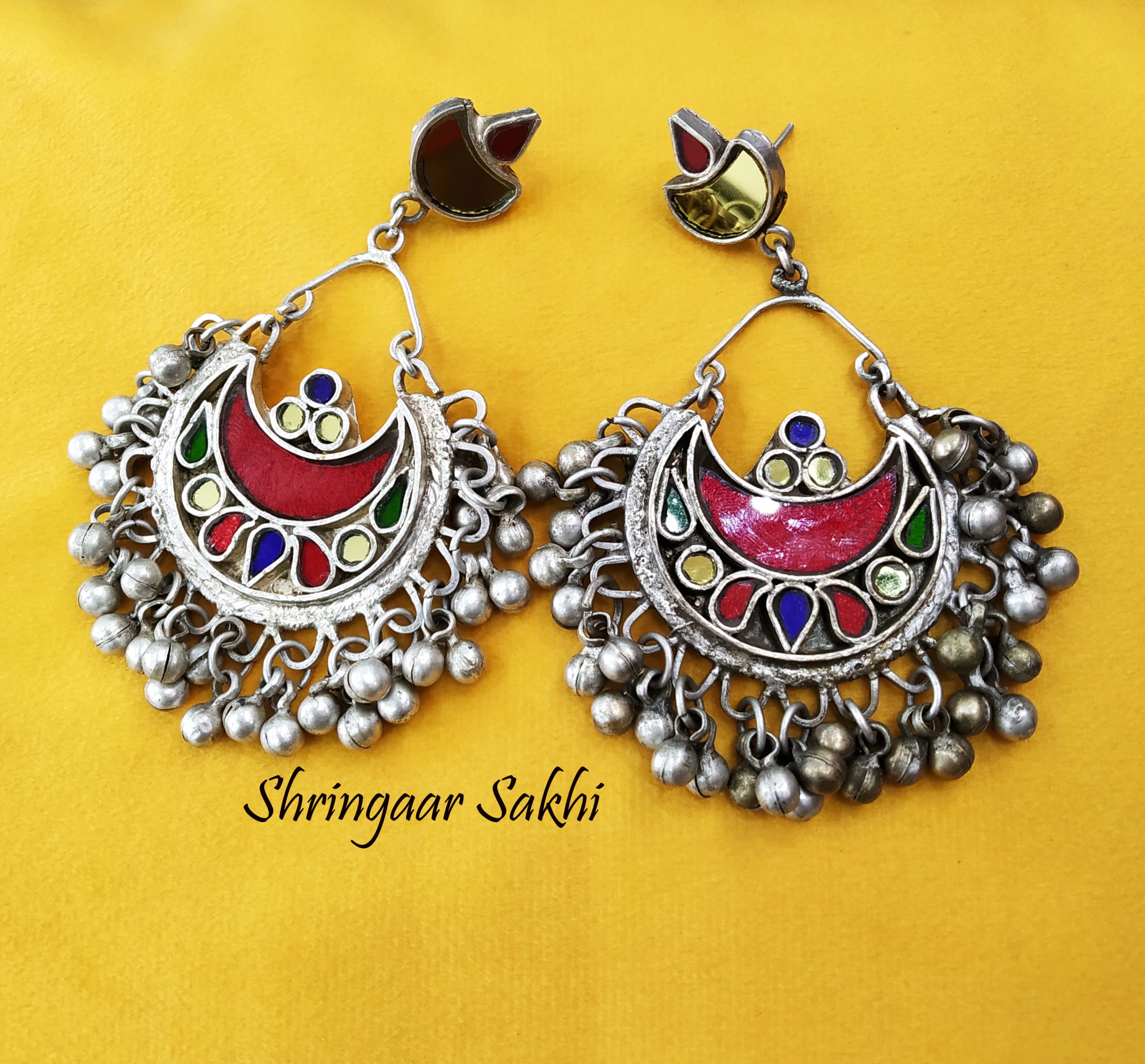 These oxidized silver earrings embody the charm of tribal and boho aesthetics, featuring crescent-shaped motifs adorned with vibrant enamel detailing in red, blue, green, and yellow. The bottom is fringed with rustic metallic ghungroos that add a subtle jingle with every movement, enhancing the folk-art inspiration behind the design. The earrings also include a unique crescent stud that complements the intricate main piece, making them a bold and playful statement accessory.