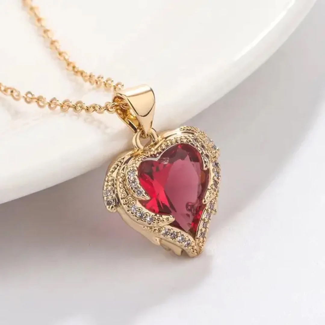 This necklace features a captivating heart-shaped red gemstone encased in an intricately designed gold-toned frame adorned with sparkling crystals. The rich crimson hue of the centerpiece exudes passion and elegance, while the golden detailing adds a touch of vintage glamour. The pendant hangs delicately from a fine gold-toned chain, making it a romantic and luxurious piece that stands out effortlessly.