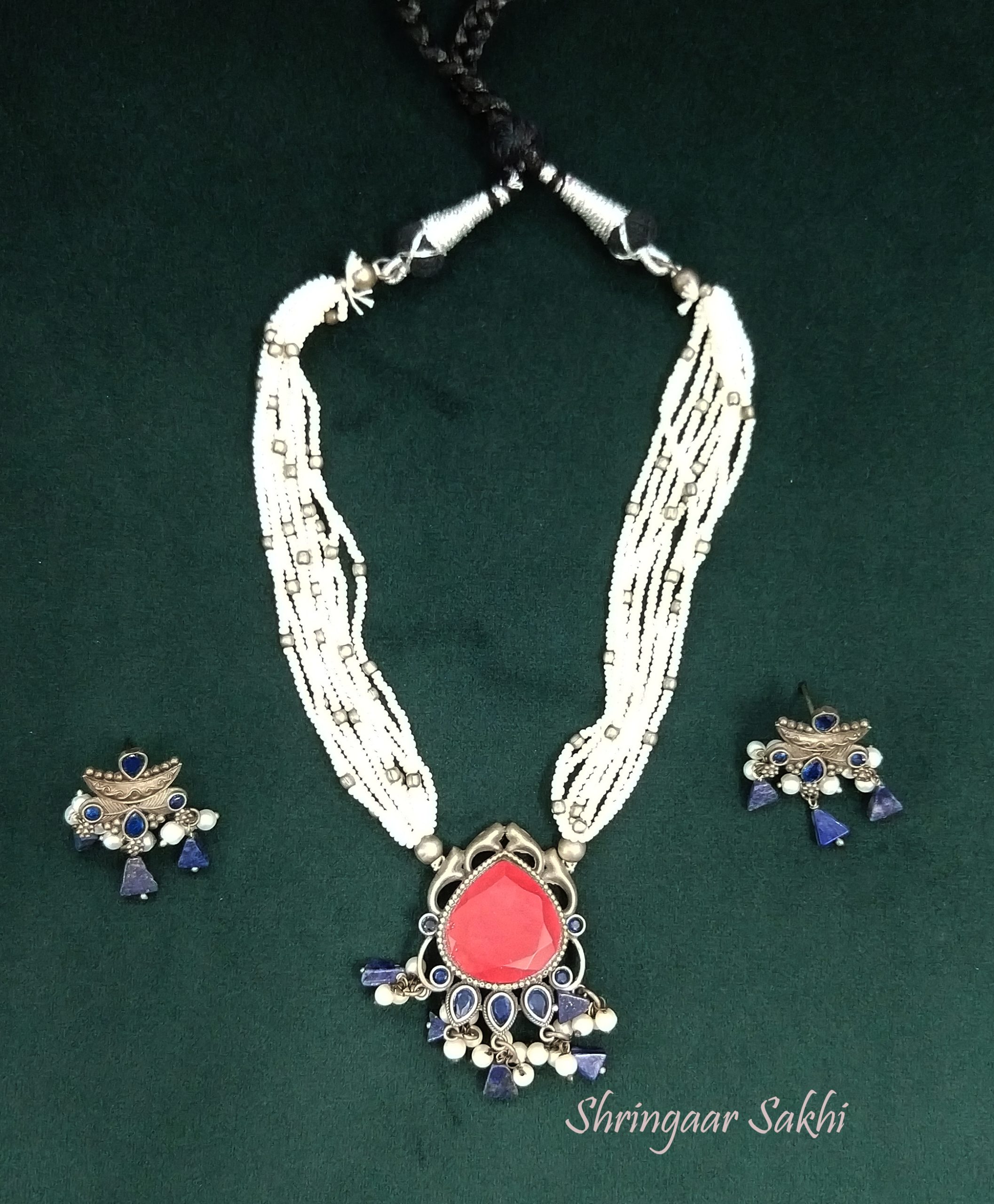 Make a bold statement with this tribal-inspired set from Shringaar Sakhi, featuring a striking red stone centerpiece, multi-strand seed beads, and oxidized charms. Paired with matching earrings, this set adds earthy elegance to sarees, kurtas, and Indo-western looks. Perfect for festive or cultural occasions.