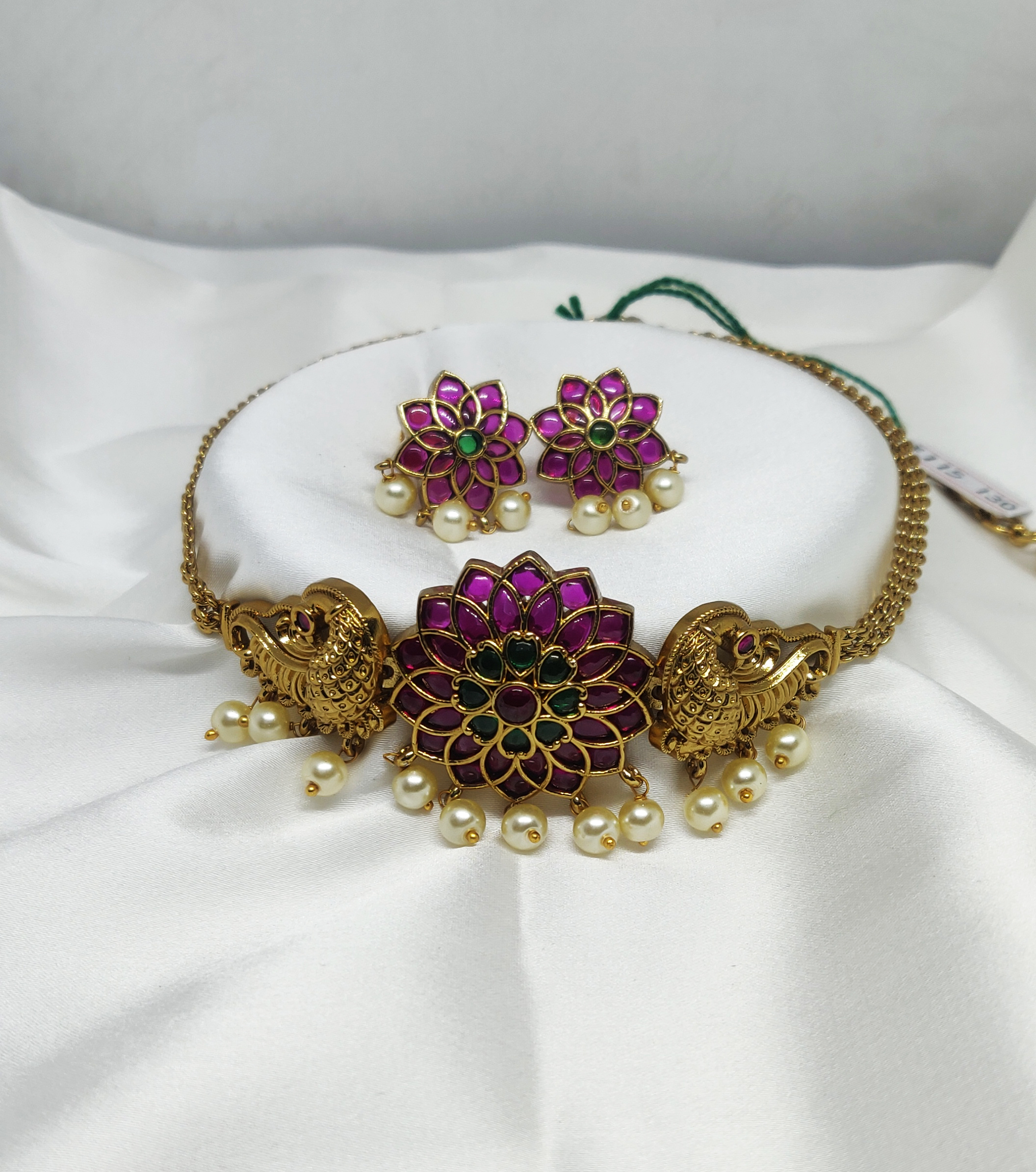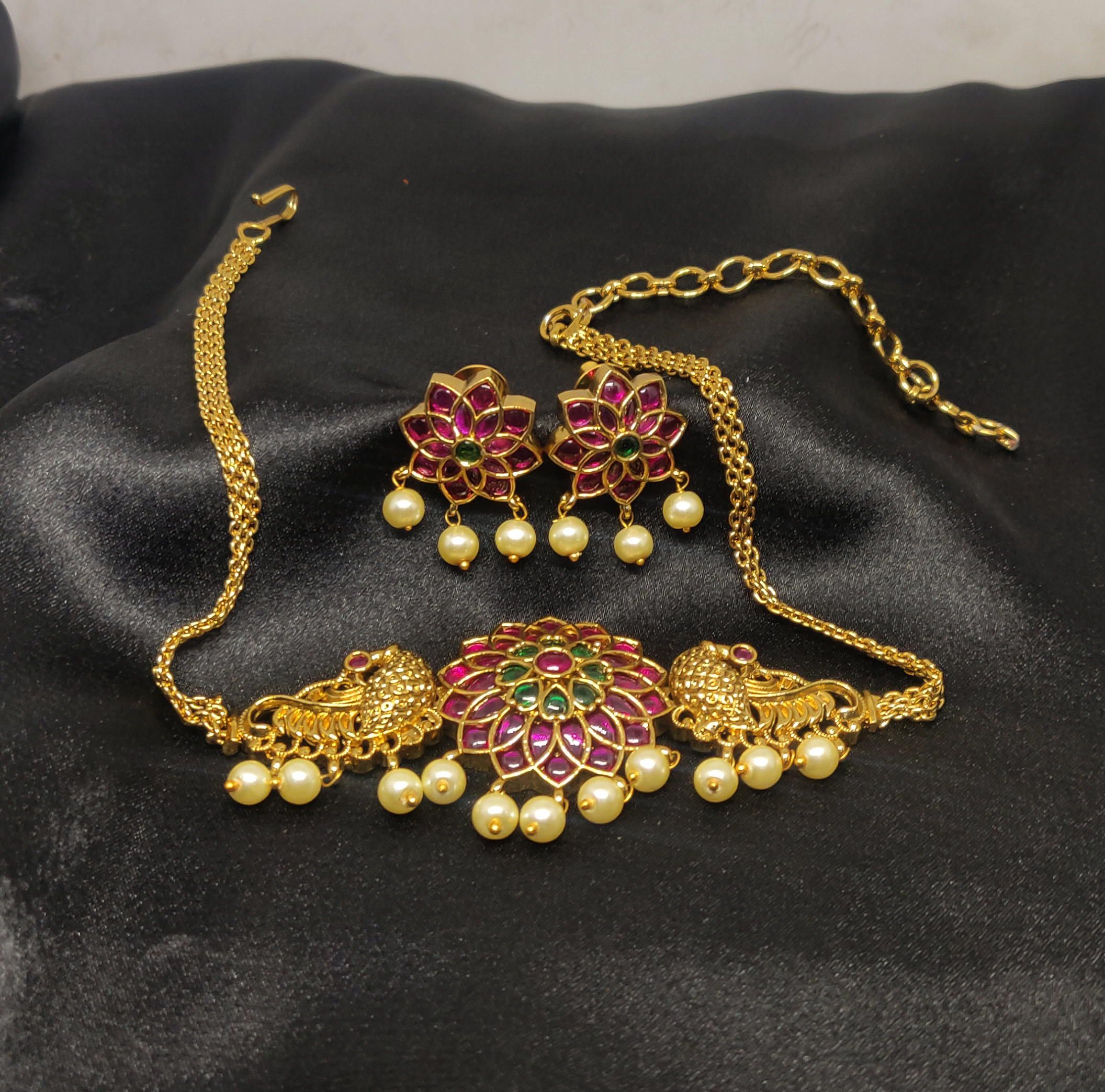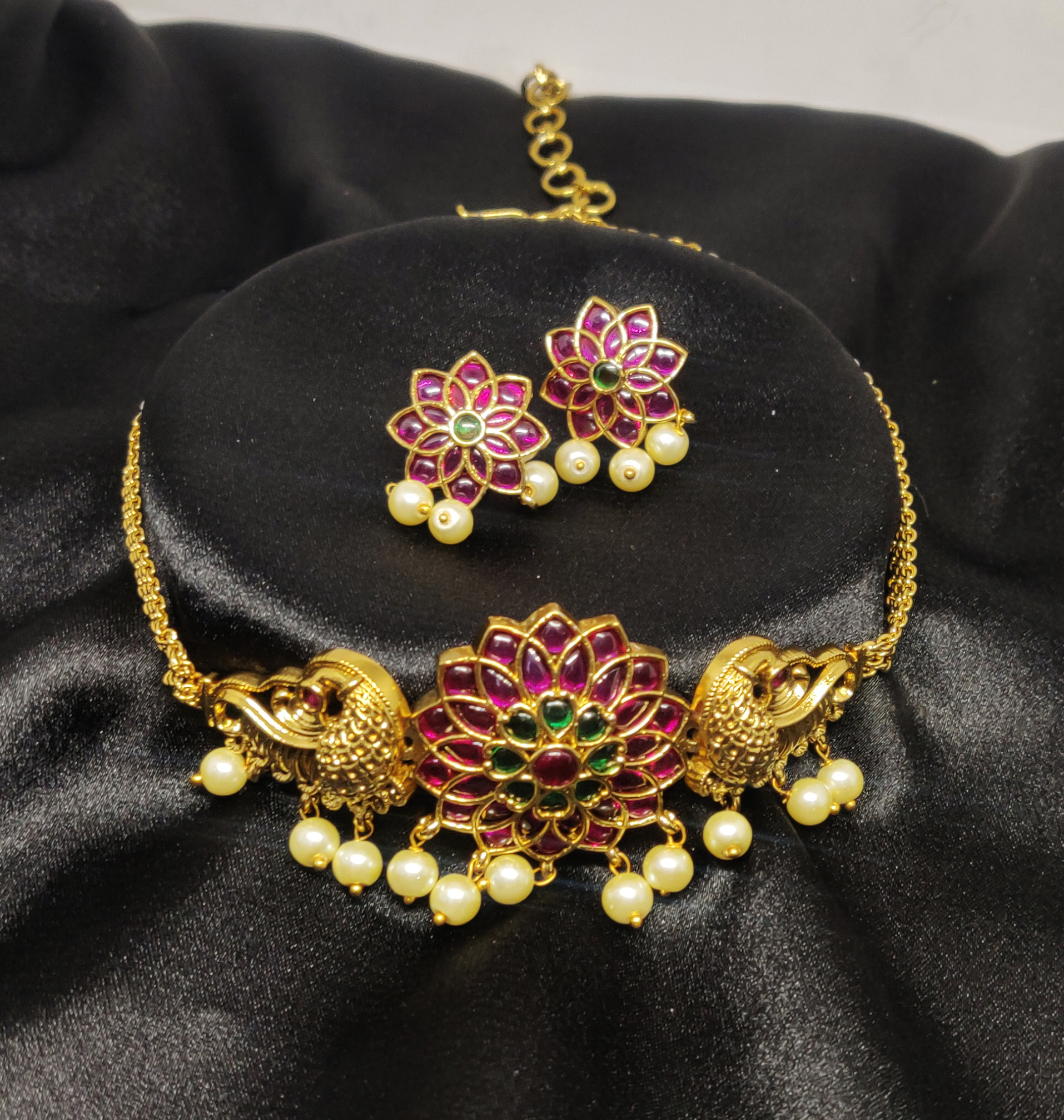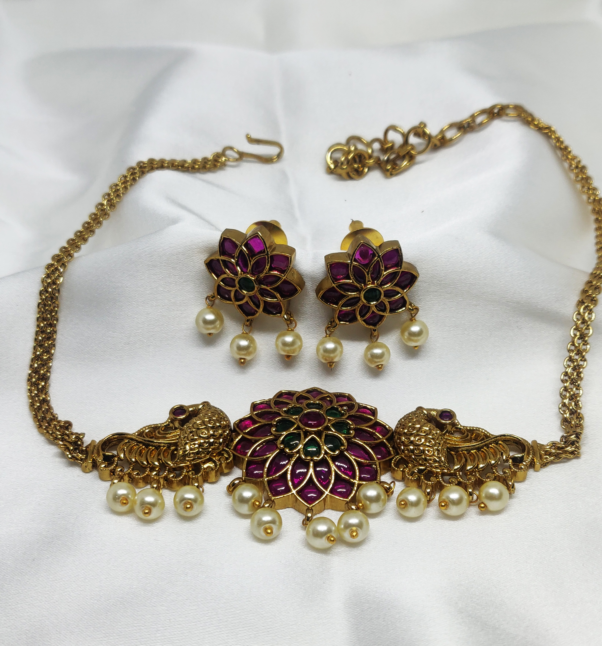 This charming necklace set features a stunning floral motif at its center, flanked by intricately carved peacocks on both sides. The rich magenta and green enamel work adds a vibrant contrast to the antique gold finish, while dangling pearls lend a soft, elegant touch. The matching earrings mirror the floral design and are adorned with pearl drops, completing the coordinated look beautifully.