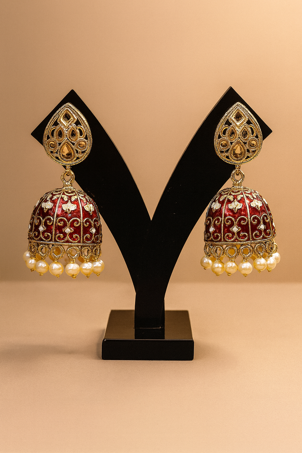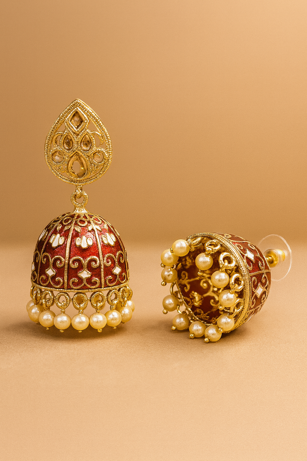 These Ruby Meenakari Pearl Jhumkas blend traditional charm with royal elegance, featuring rich ruby-red enamel work and intricate gold detailing. The finely carved dome design is complemented by delicate pearl drops that add movement and grace. Lightweight yet luxurious, they make a perfect accessory for festive functions, weddings, and traditional celebrations. These jhumkas instantly elevate your ethnic look with their vibrant colour and timeless craftsmanship.