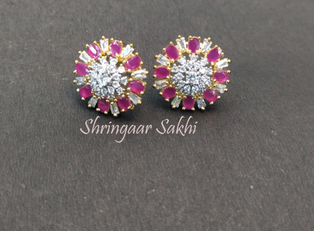These stunning earrings feature a vibrant combination of ruby stones surrounding a central cluster of sparkling clear crystals, all set in a luxurious gold-toned base. The floral-inspired design, with alternating ruby and crystal elements, adds a touch of elegance and glamour, making them perfect for festive occasions or special events.
