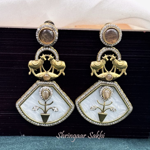 These exquisite earrings feature a beautiful blend of heritage design and modern detailing. The top part is adorned with a round brown gemstone surrounded by crystals, followed by a pair of golden cows intricately carved into the design. The lower portion showcases a fan-shaped mother-of-pearl inlay with a delicate floral motif, accented by small green stones and framed by sparkling crystals. The combination of natural hues and gold details evokes an elegant and timeless appeal.
