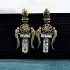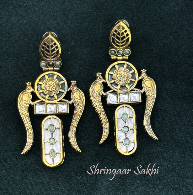 These statement earrings showcase a traditional yet bold design, featuring intricate detailing in gold with accents of pearl and green stones. The earrings highlight bird motifs on either side of the central floral pattern, symbolizing elegance and a touch of heritage. With an antique finish, these earrings bring out an old-world charm and a unique character to any look.