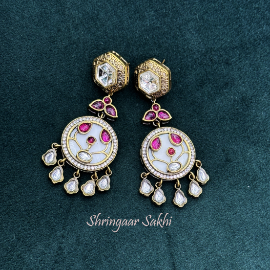 These earrings feature a stunning blend of traditional and contemporary design elements. The circular centerpiece is adorned with delicate ruby and white enamel work, surrounded by intricate detailing and crystals that add a touch of elegance. Dangling crystal drops enhance the movement and sparkle, making this a timeless piece perfect for festive or formal occasions.