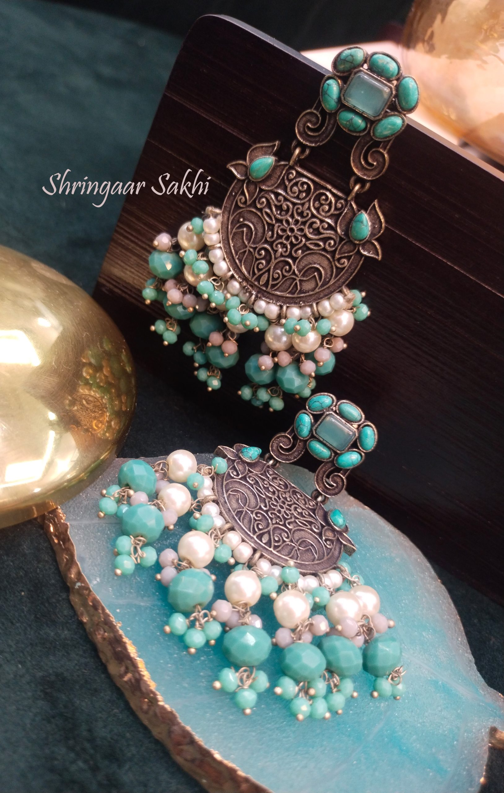 These oxidized silver earrings feature an intricate round motif with engraved floral patterns and a top stud adorned with turquoise stones. The lower fringe is beautifully detailed with aqua blue beads and white pearls, giving it a fresh, elegant look.