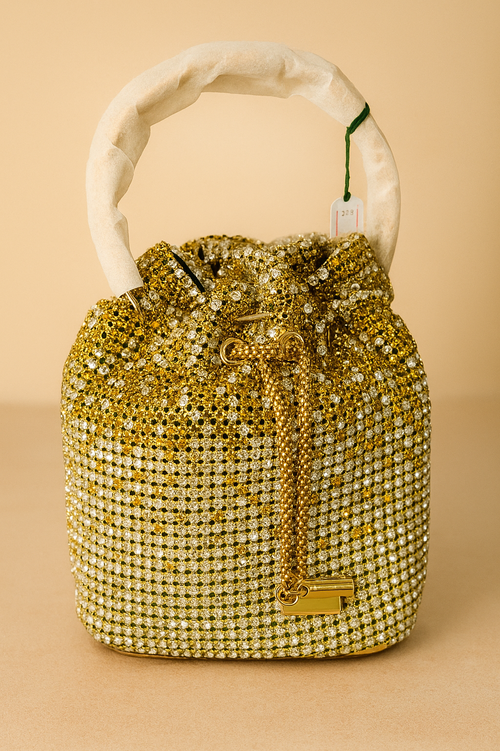 This golden crystal potli beautifully complements bridal, festive, and partywear outfits. Pair it with gold-accented lehengas, sarees, or anarkalis to enhance your overall look with a coordinated glow. It also elevates Indo-western gowns and cocktail dresses, adding the perfect hint of sparkle without overwhelming the outfit. Add gold jewelry — like statement earrings, chokers, or bangles — to create a cohesive and glamorous ensemble. Whether you’re attending a wedding, reception, or festive event, this potli instantly transforms your style with luxe shimmer.