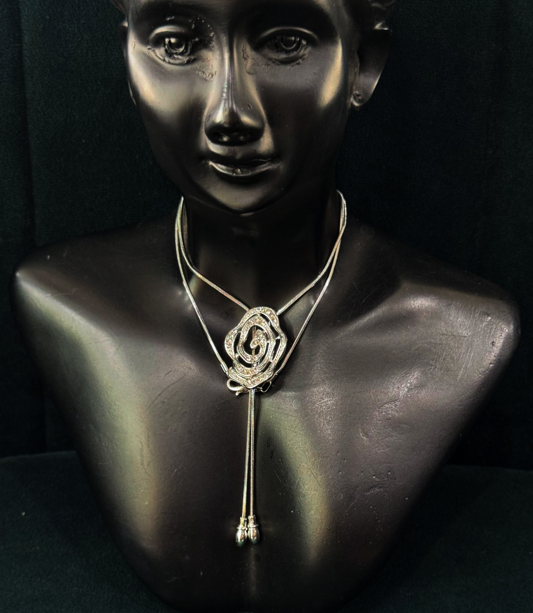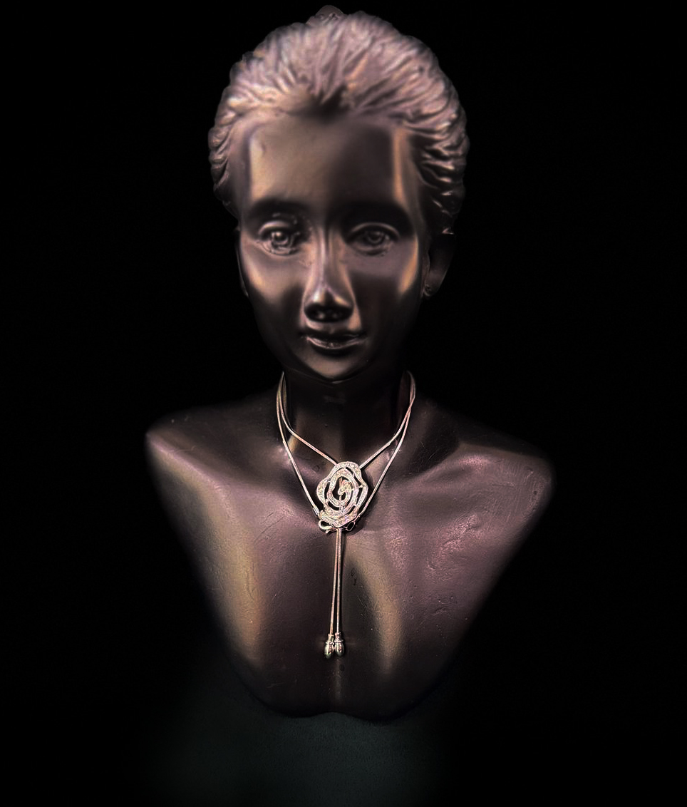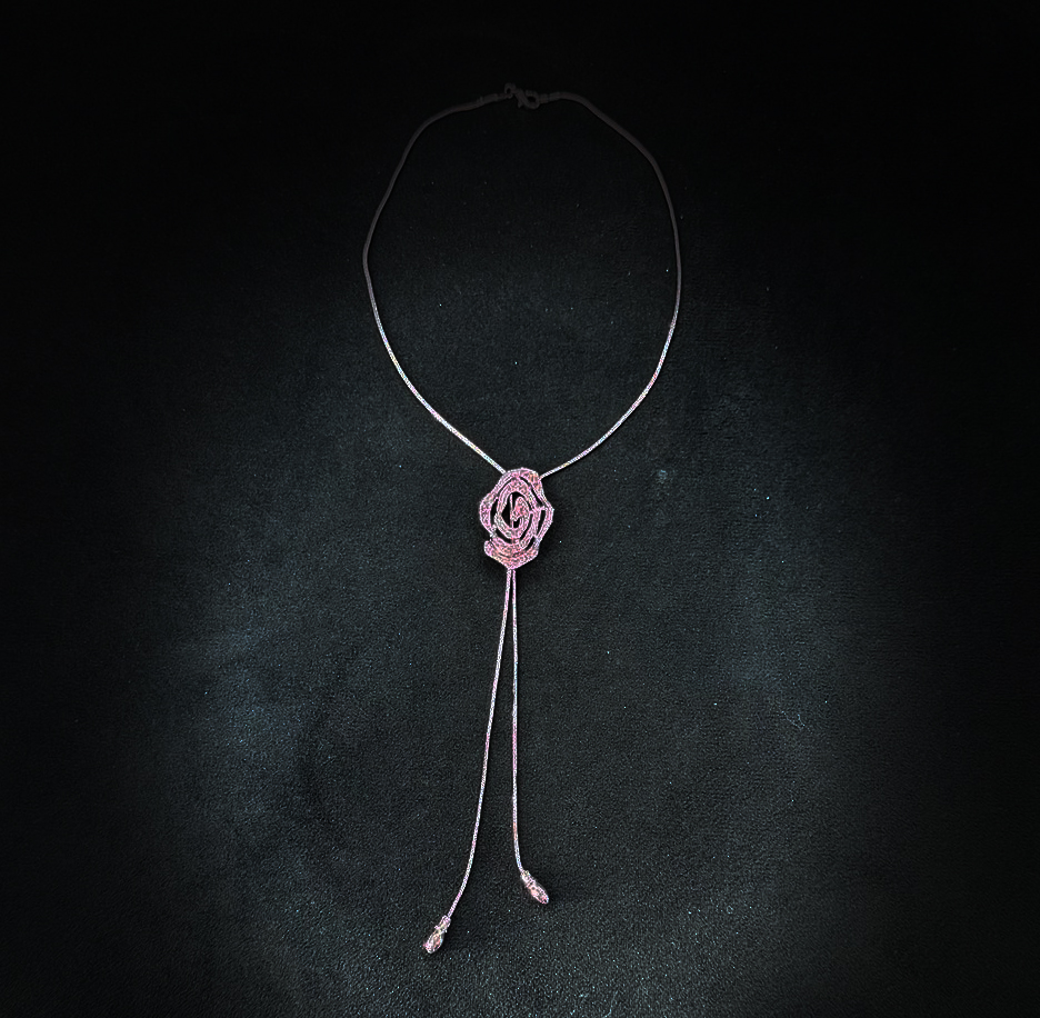 This bold silver necklace features a distinctive floral-inspired centerpiece that doubles as a front lock, adding both charm and practicality to the design. The intricately layered rose motif, accented with shimmering stones, sits gracefully at the base of the neck while two sleek metallic tassels extend downward, enhancing the necklace’s statement appeal. The adjustable front closure ensures a snug fit and adds an edgy, contemporary twist.