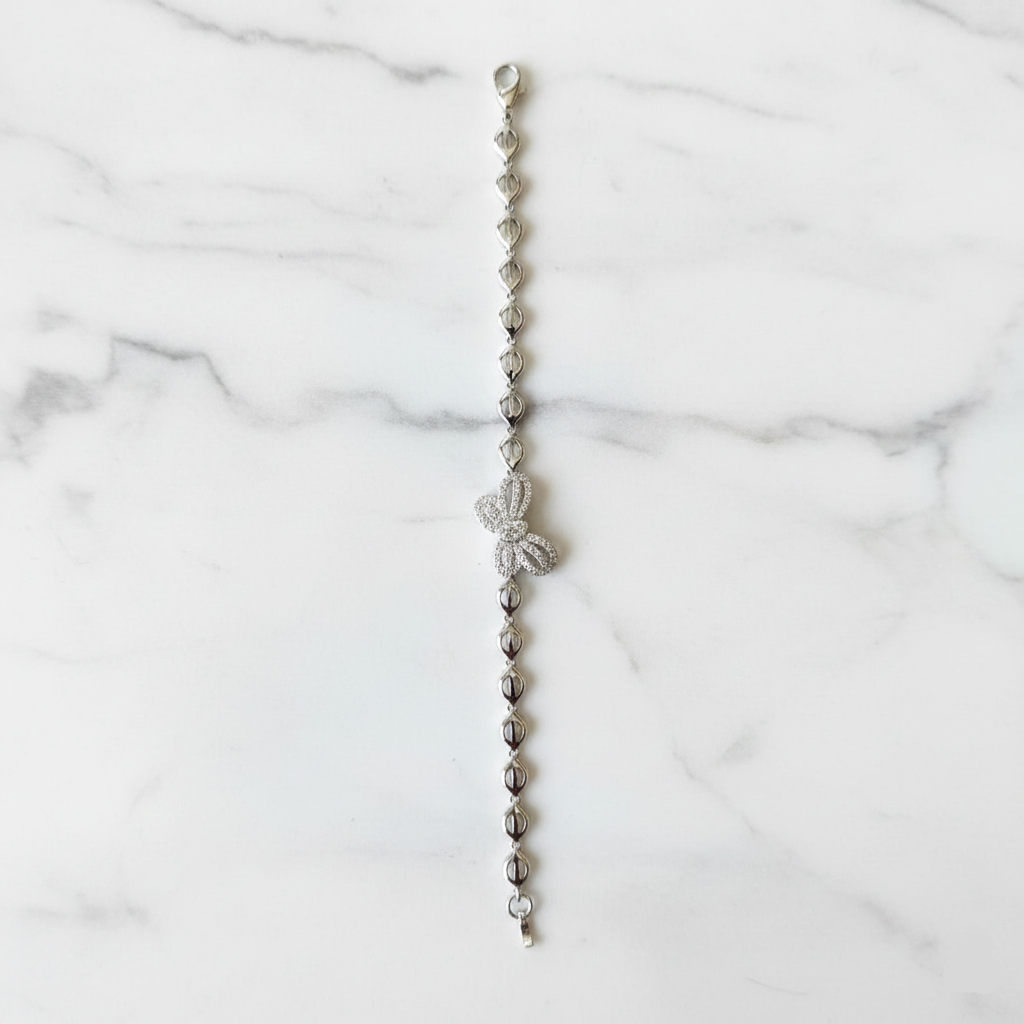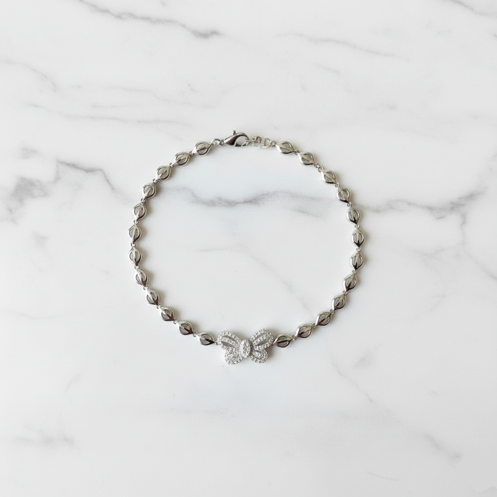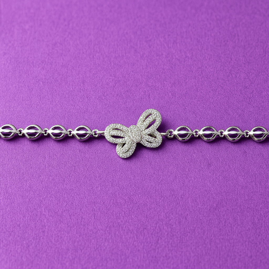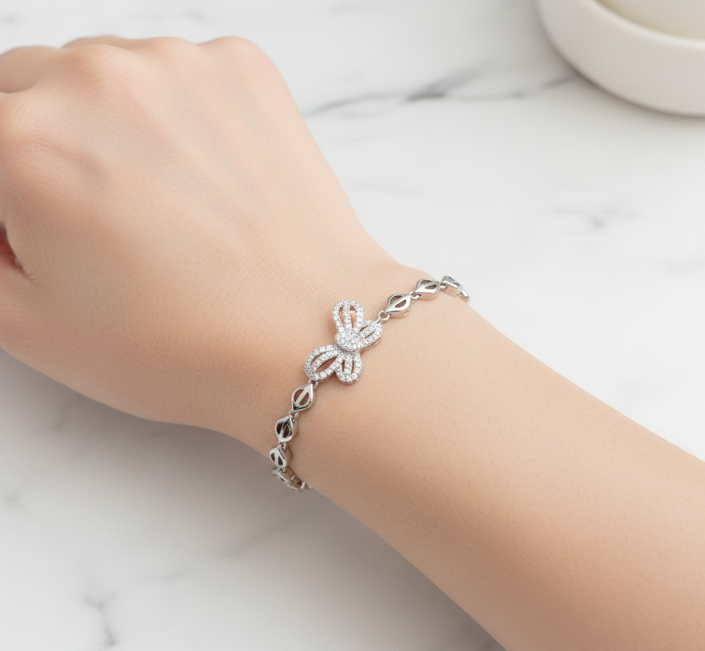 The Silver Butterfly Grace Bracelet features an elegant butterfly centerpiece crafted with shimmering CZ detailing, connected to a sleek chain of polished silver links. Its lightweight and refined design adds a delicate charm to any wrist, making it perfect for both daily wear and special occasions. The bracelet offers a comfortable fit and a premium shine that elevates any outfit effortlessly. A beautiful blend of grace, sparkle, and timeless style.