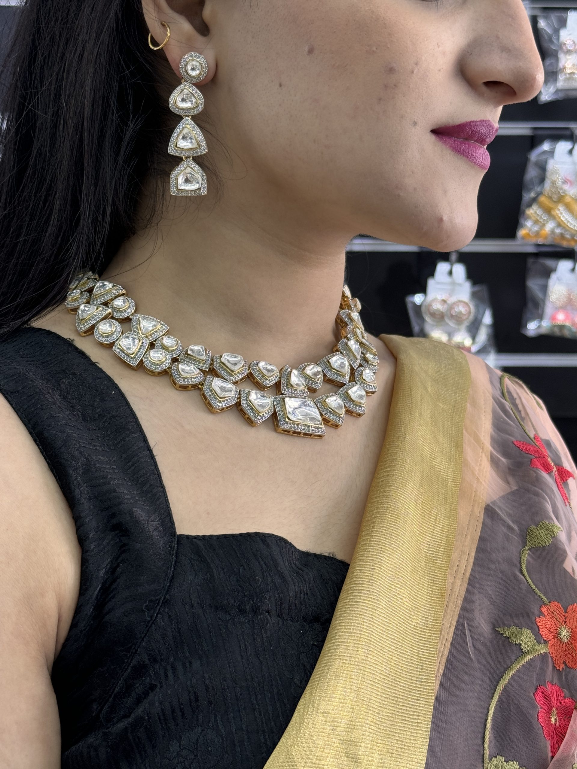 This Pachi Kundan silver necklace is perfect for a party wear look. The necklace features intricate kundan stones set in a silver frame. The necklace is finished with a fish hook closure for easy wear. This necklace is sure to make a statement at any special occasion.