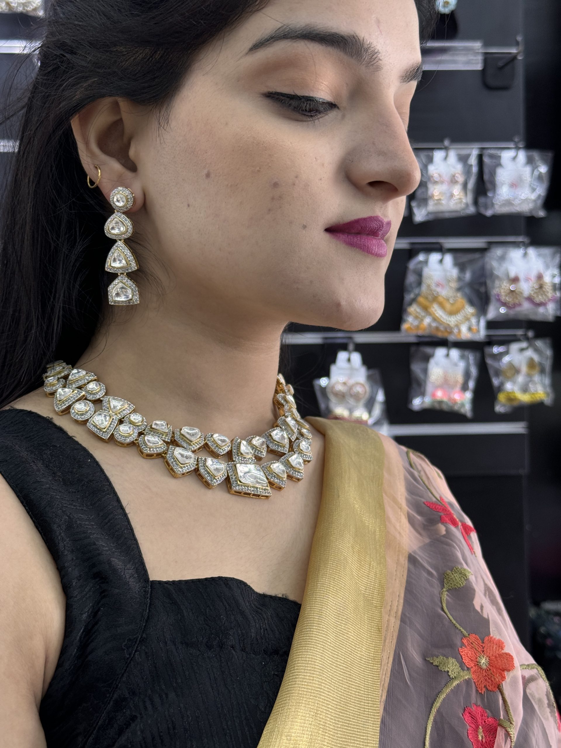 This silver double layered Pachi Kundan necklace set is a versatile piece of jewelry that can be paired with a wide range of colors and outfits, so don’t be afraid to experiment and find what works best for your personal style and the occasion. A black outfit would create a striking contrast with the silver necklace set. A black cocktail dress or black jumpsuit would be a great choice for a formal event. A white outfit would make the silver necklace set stand out. A white blouse and pants or a white dress would be perfect for a summer event. A red dress or a red blouse and skirt would be perfect for a formal event. Emerald green is a vibrant color that would create a striking contrast with the silver necklace set.