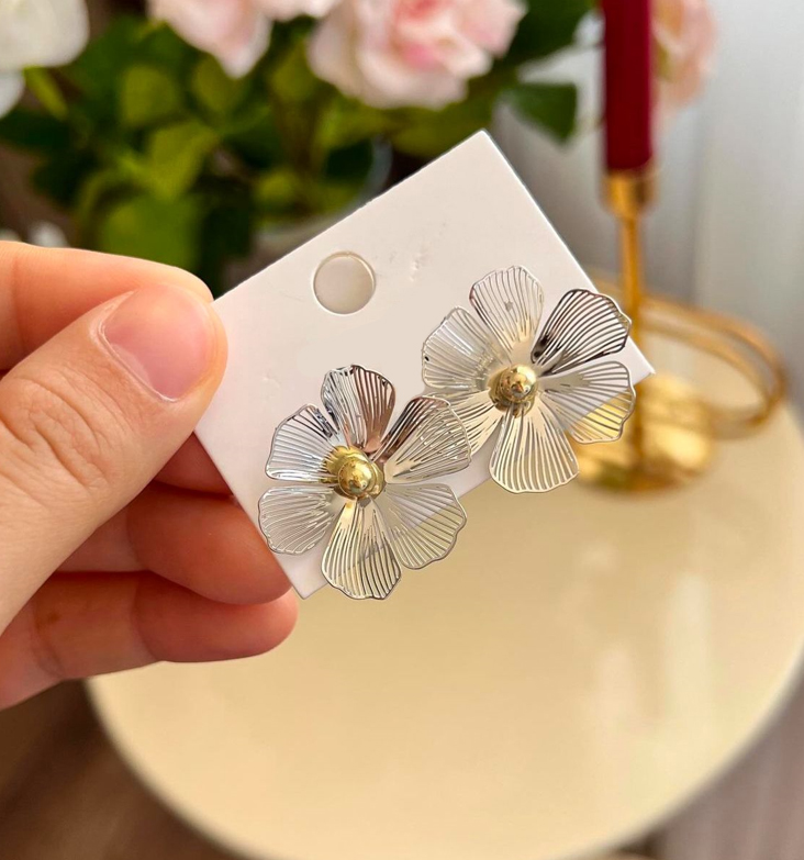 These stunning silver floral earrings showcase an intricate five-petal design with fine linear etching that creates a delicate, lace-like effect. At the center of each flower sits a luminous pearl bead, adding a sophisticated and timeless charm. The metallic sheen of the petals paired with the pearl’s soft glow strikes a perfect balance between modern artistry and classic elegance.
