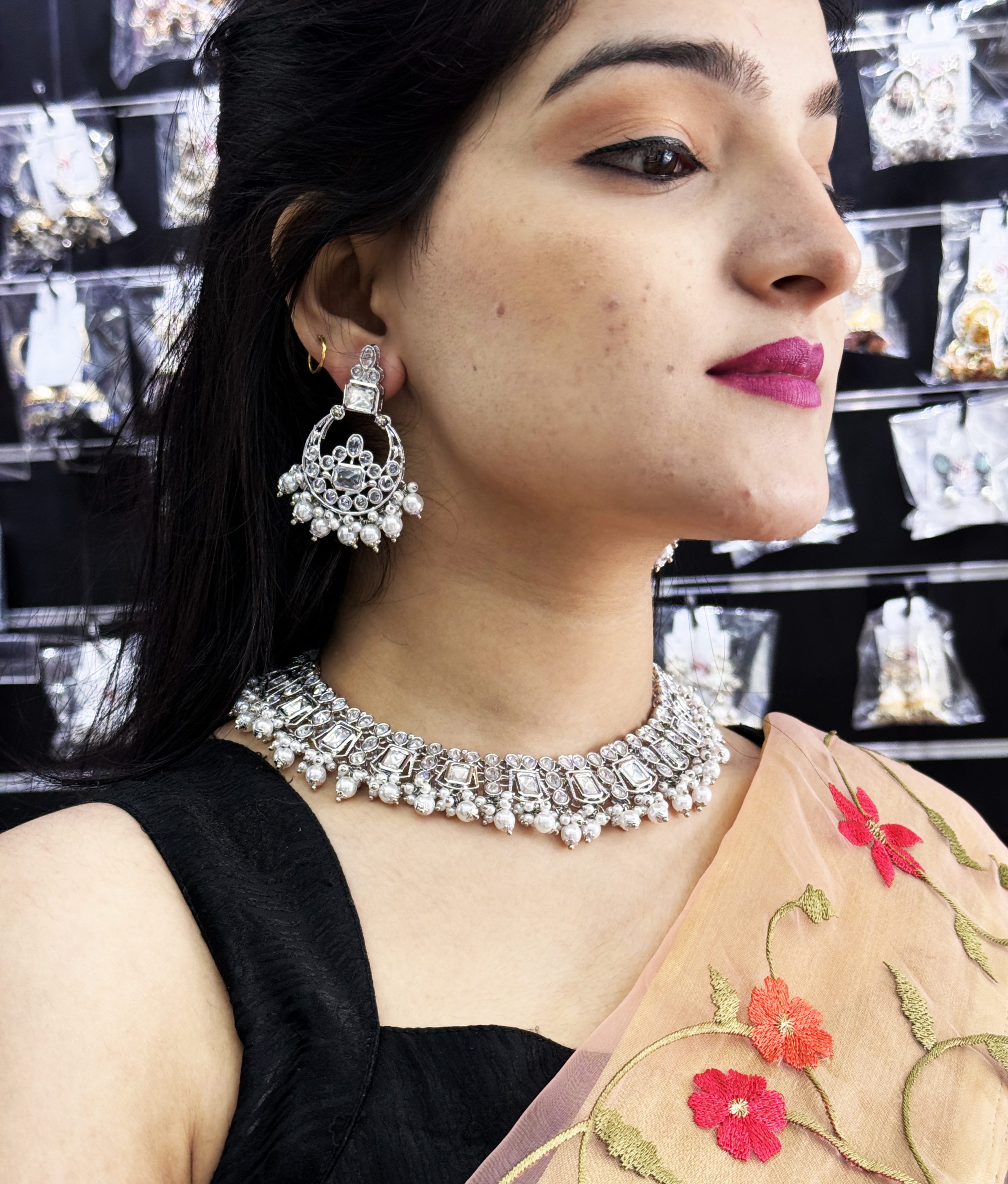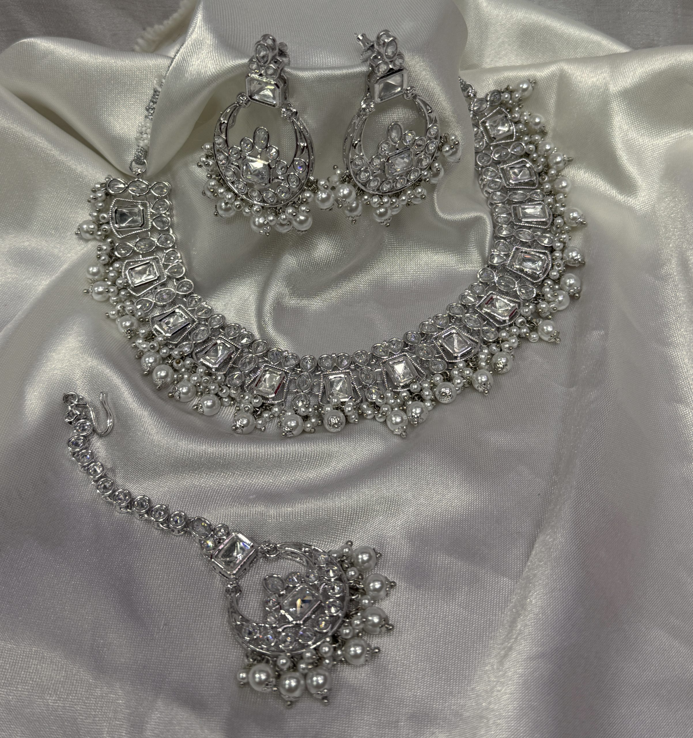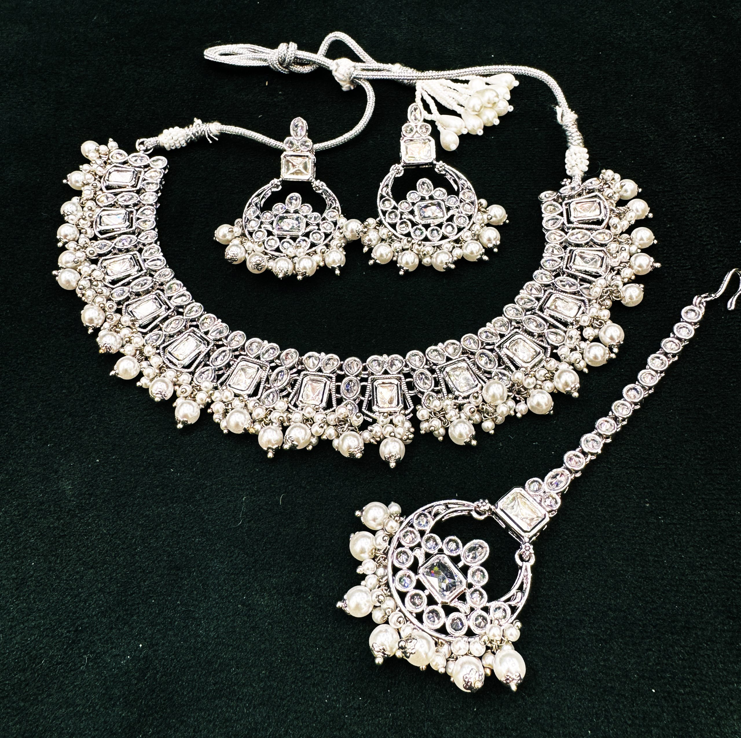 This necklace set features an intricate silver-tone design with square and circular stonework, beautifully accented by pearls. The matching earrings and maang tikka follow the same motif, adding to the royal and traditional feel of the set.