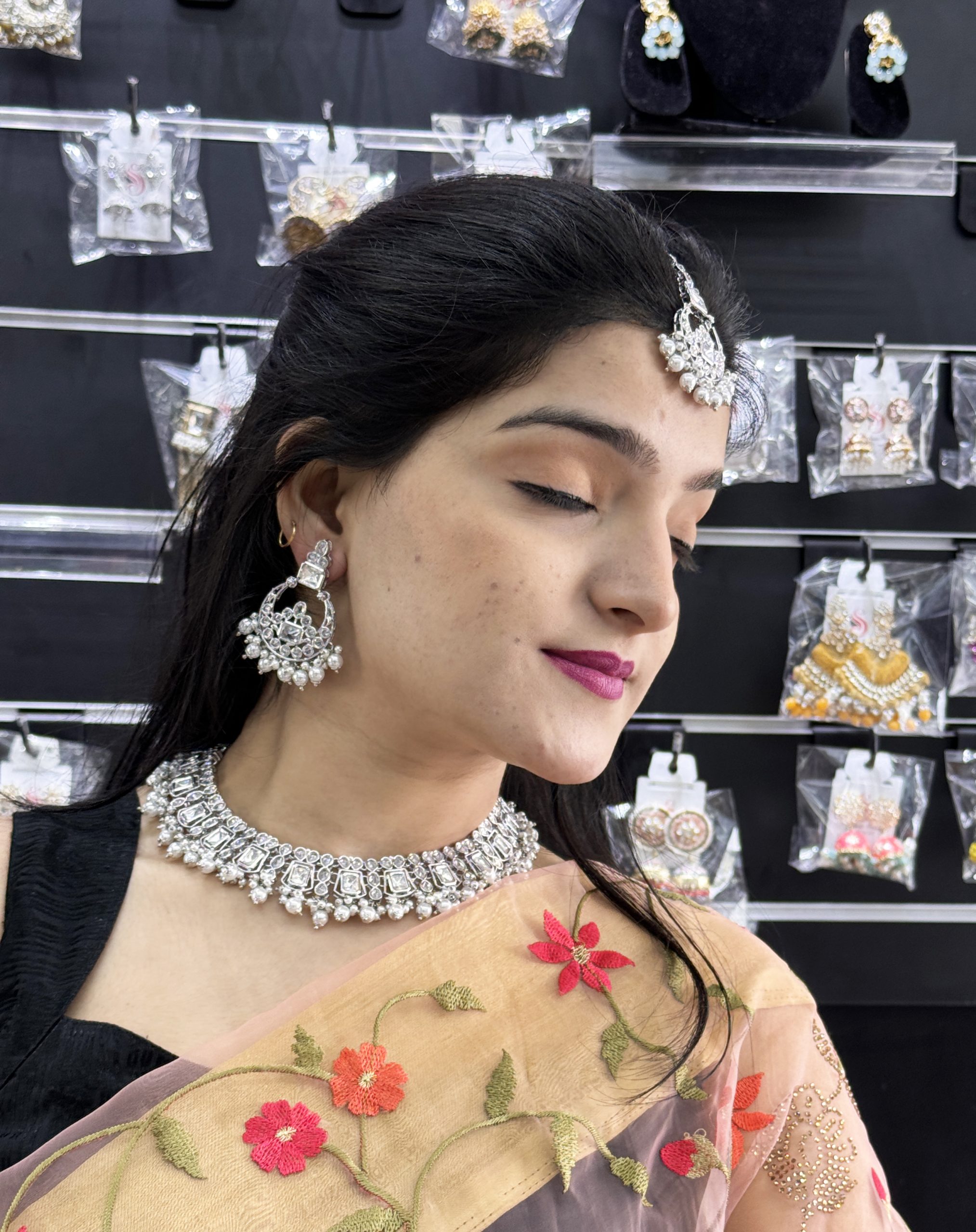 The pearl drops of this necklace enhance its elegance, making it ideal for pairing with ivory, silver, or pastel-colored sarees and lehengas. This set would be perfect for weddings or festive occasions, especially when styled with a sleek bun or braid, allowing the jewellery to take center stage. Minimal makeup with a focus on glowing skin and bold eyes will complete the look.