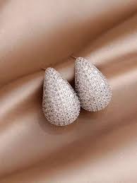 These teardrop-shaped earrings exude elegance and sophistication with their fully encrusted design. Dazzling with fine, crystal-like stones, they shimmer beautifully under any light, giving off a luxe and refined appearance. Their smooth, rounded silhouette and uniform sparkle make them a timeless accessory that can easily elevate any outfit.