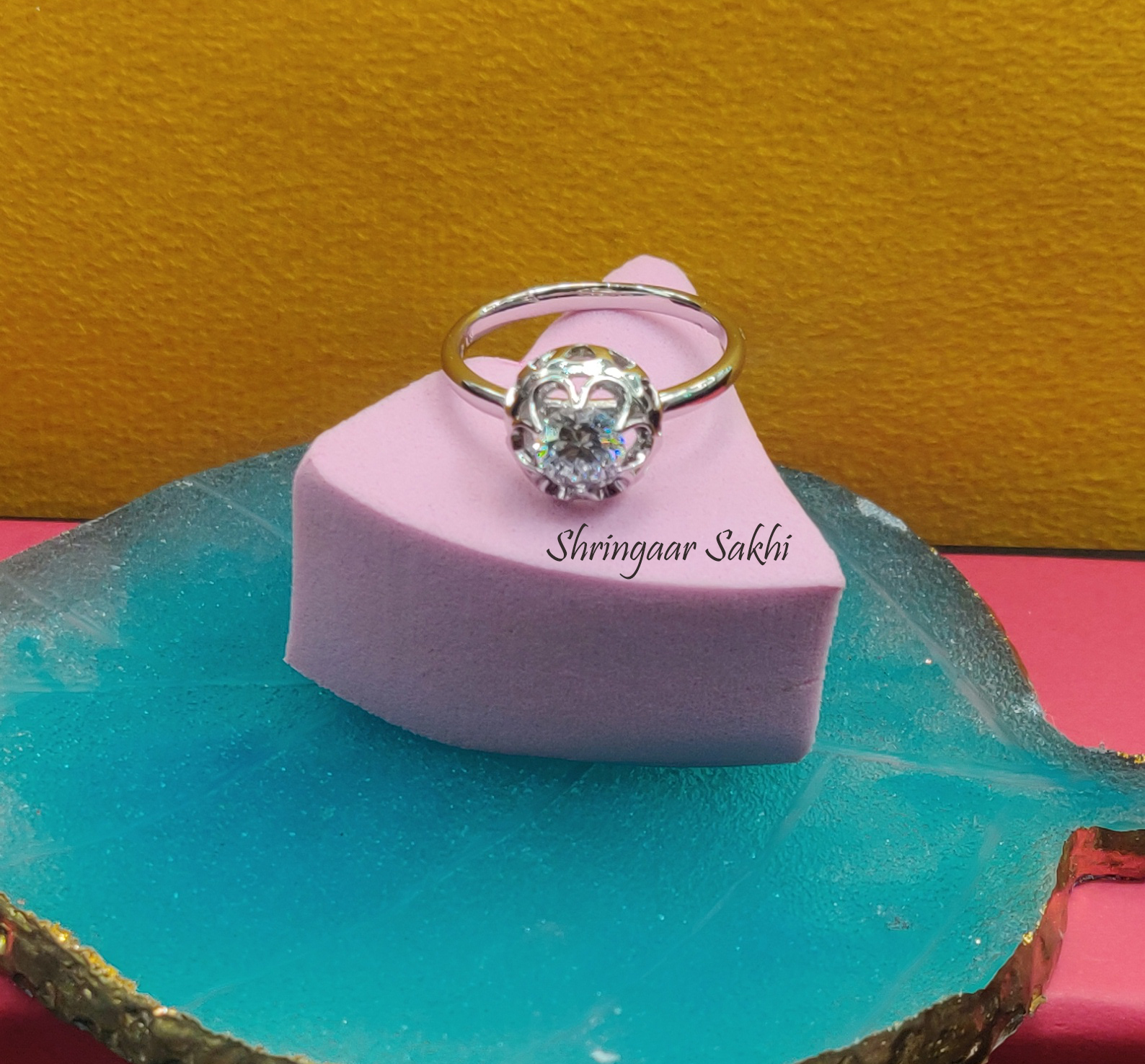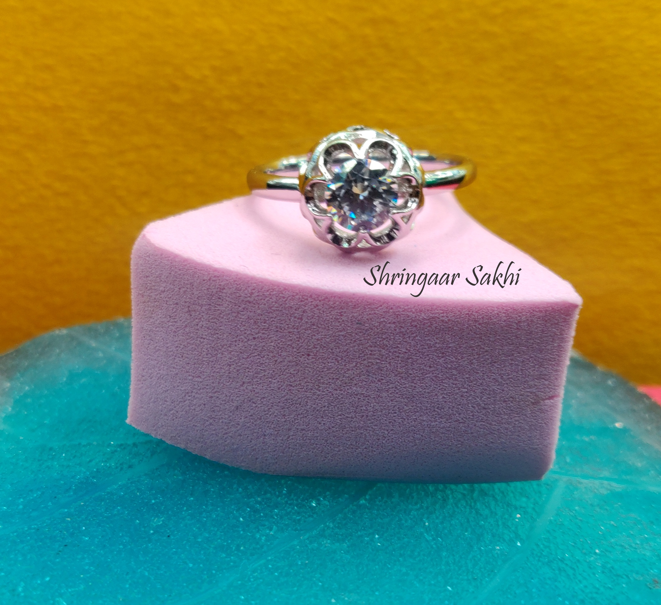 This stunning finger ring from Shringaar Sakhi features a brilliant-cut central stone encased in a delicate floral-inspired silver setting. The intricate petal design around the solitaire adds a soft, feminine charm, while the high-polish silver finish enhances its elegance. Designed to sparkle from every angle, this ring is perfect for those who love classic jewelry with a romantic twist.