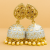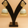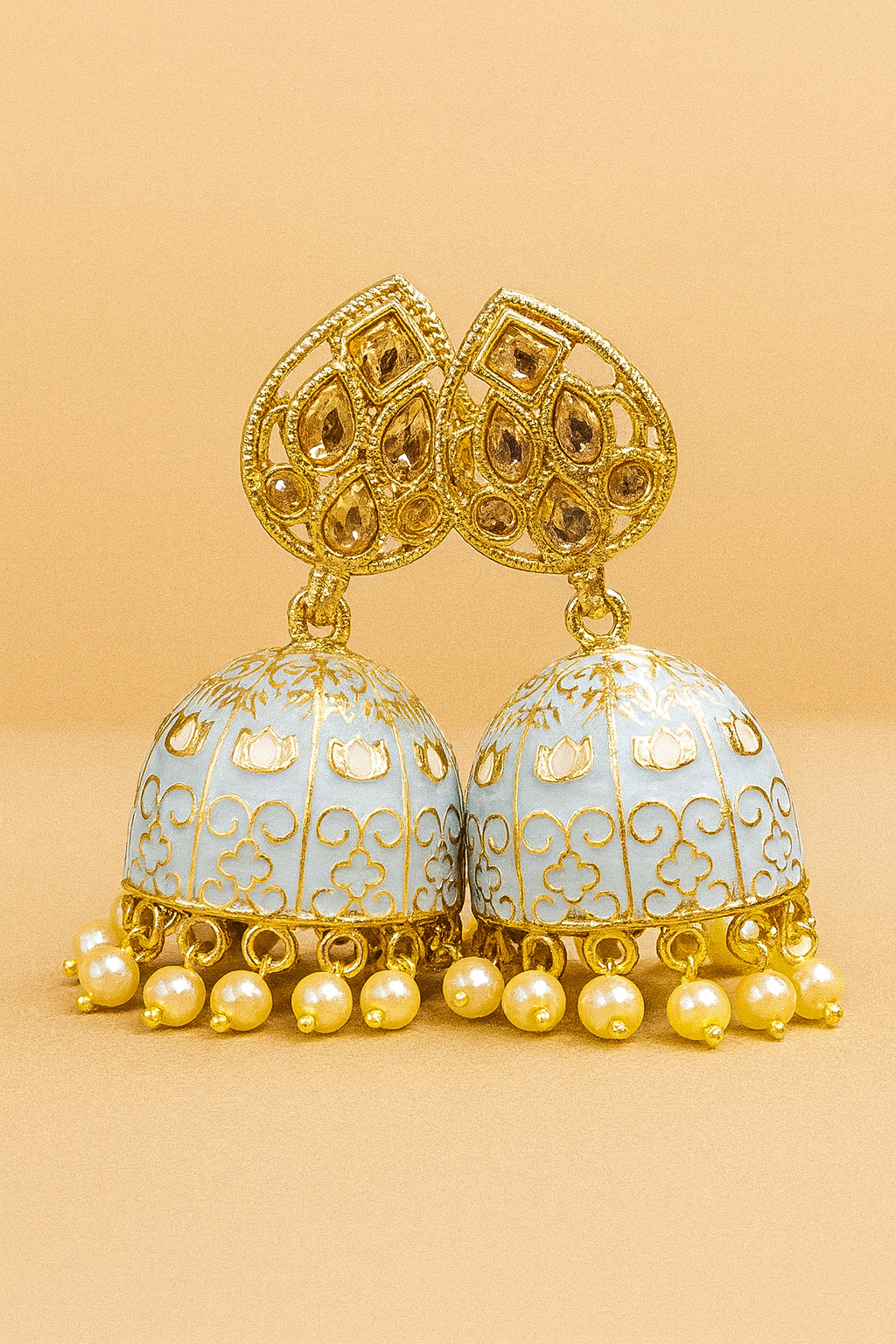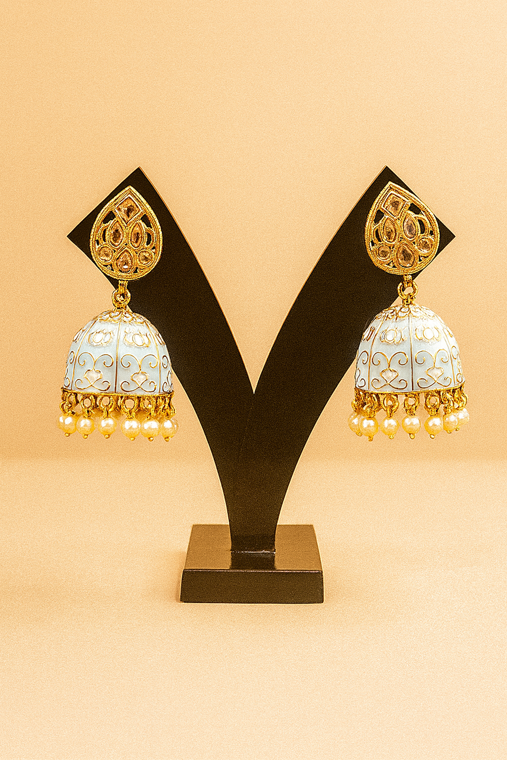 These Ice Blue Meenakari Pearl Jhumkas combine soft pastel elegance with traditional craftsmanship. The delicate blue enamel is beautifully highlighted with intricate gold detailing and shimmering pearl drops that give the pair a graceful movement. Lightweight and eye-catching, they perfectly complement festive, ethnic, and wedding looks. Ideal for day functions, haldi ceremonies, or elegant evening celebrations, these jhumkas add a serene charm to any outfit.