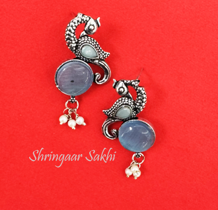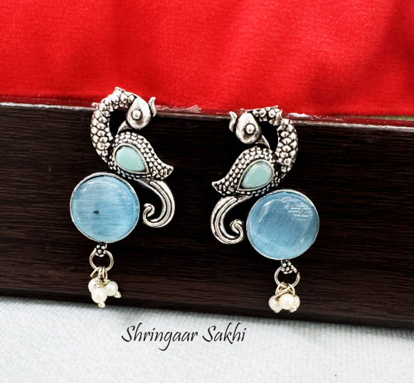 These earrings showcase a striking design with sky-blue stones set against a silver fish motif, complemented by delicate pearls dangling at the bottom. The detailed craftsmanship of the fish adds a touch of artistry and tradition, while the soft blue stones bring a calming, serene vibe to the overall look.
