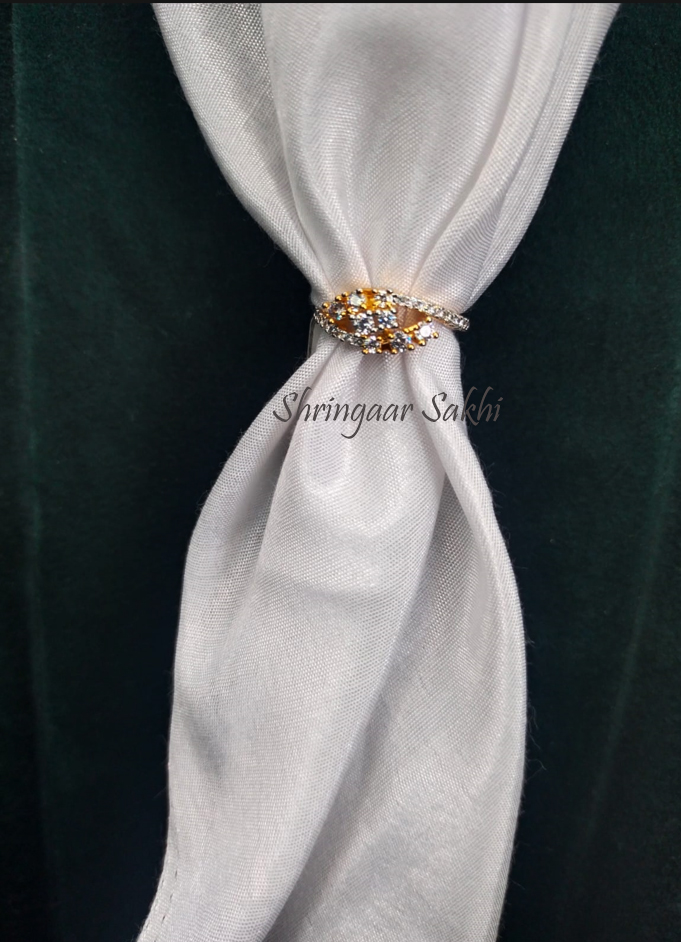 This intricately crafted ring boasts a floral-inspired cluster of golden and silver stones set against a shimmering band. Its asymmetrical design and brilliant sparkle evoke a sense of whimsical sophistication, perfect for someone who appreciates elegance with a twist. The mix of warm and cool tones gives it a versatile charm, effortlessly blending traditional motifs with modern finesse.