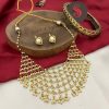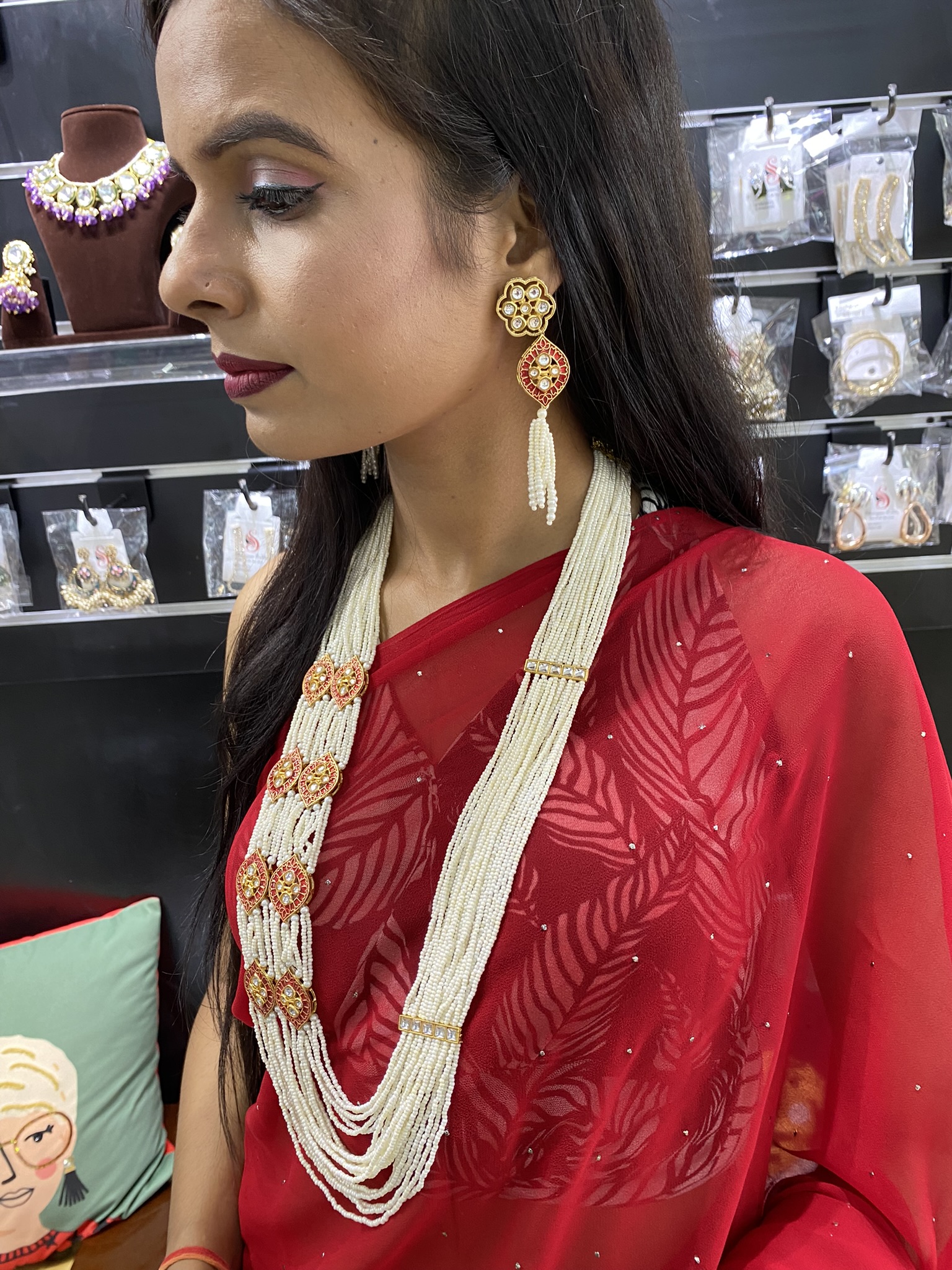This is the “Rani Pearl Majesty” Set – a grand collection of a long pearl necklace, matching earrings, and a bracelet. The necklace features beautiful pearls hanging gracefully, with delicate kundan designs adding an old-world charm. The earrings and bracelet complete the look. This set is perfect for special occasions like weddings and formal events.