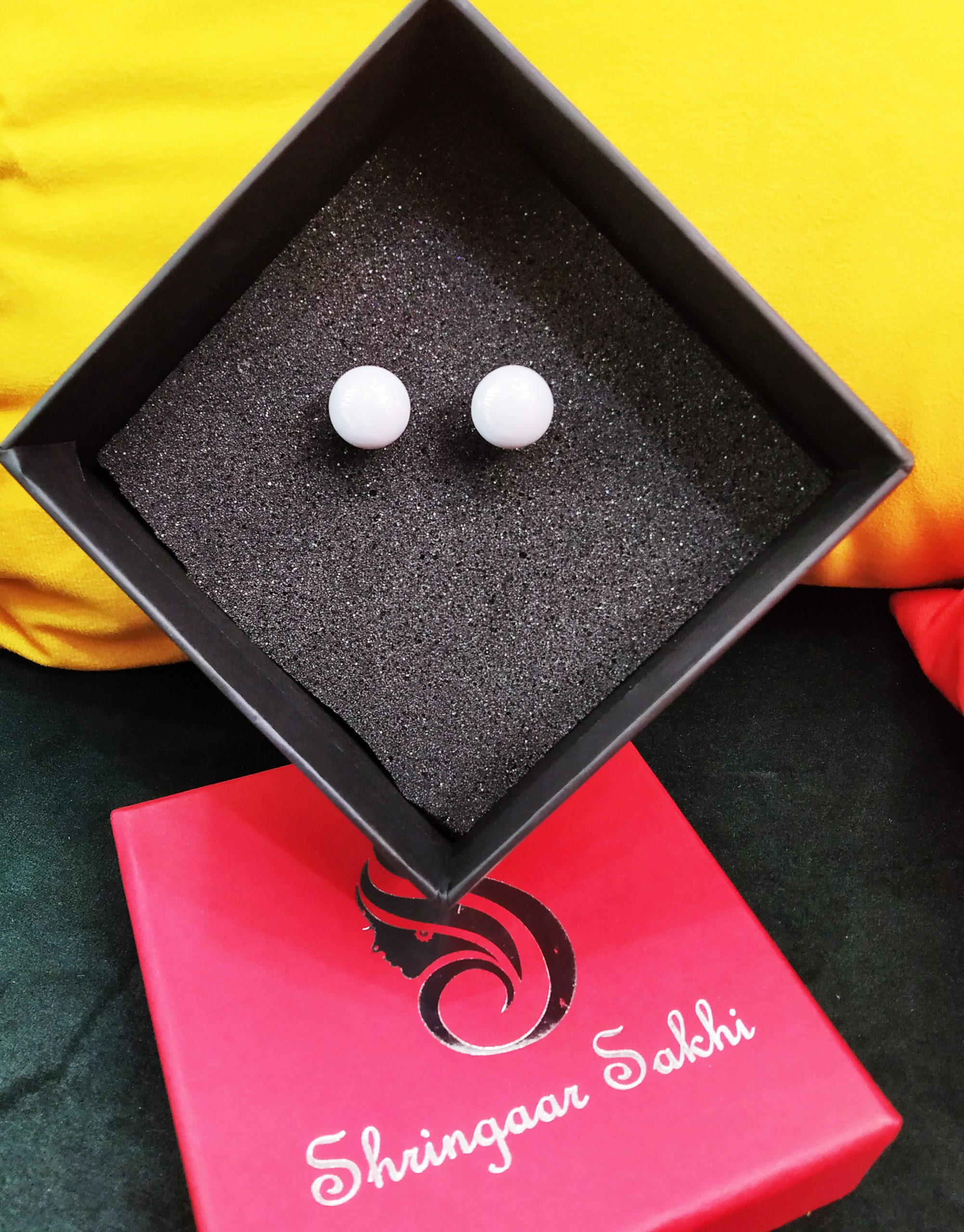 The white color allows them to pair easily with a wide range of styles, from traditional attire like sarees and kurtis to contemporary outfits such as dresses or blouses. These classic white studs are perfect for those who appreciate understated yet stylish accessories that can be worn daily or for special occasions.