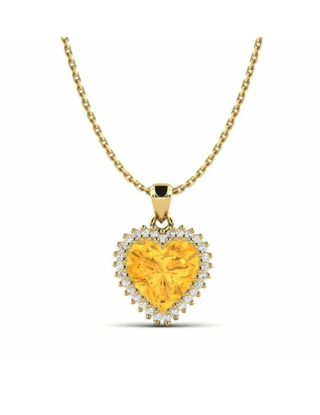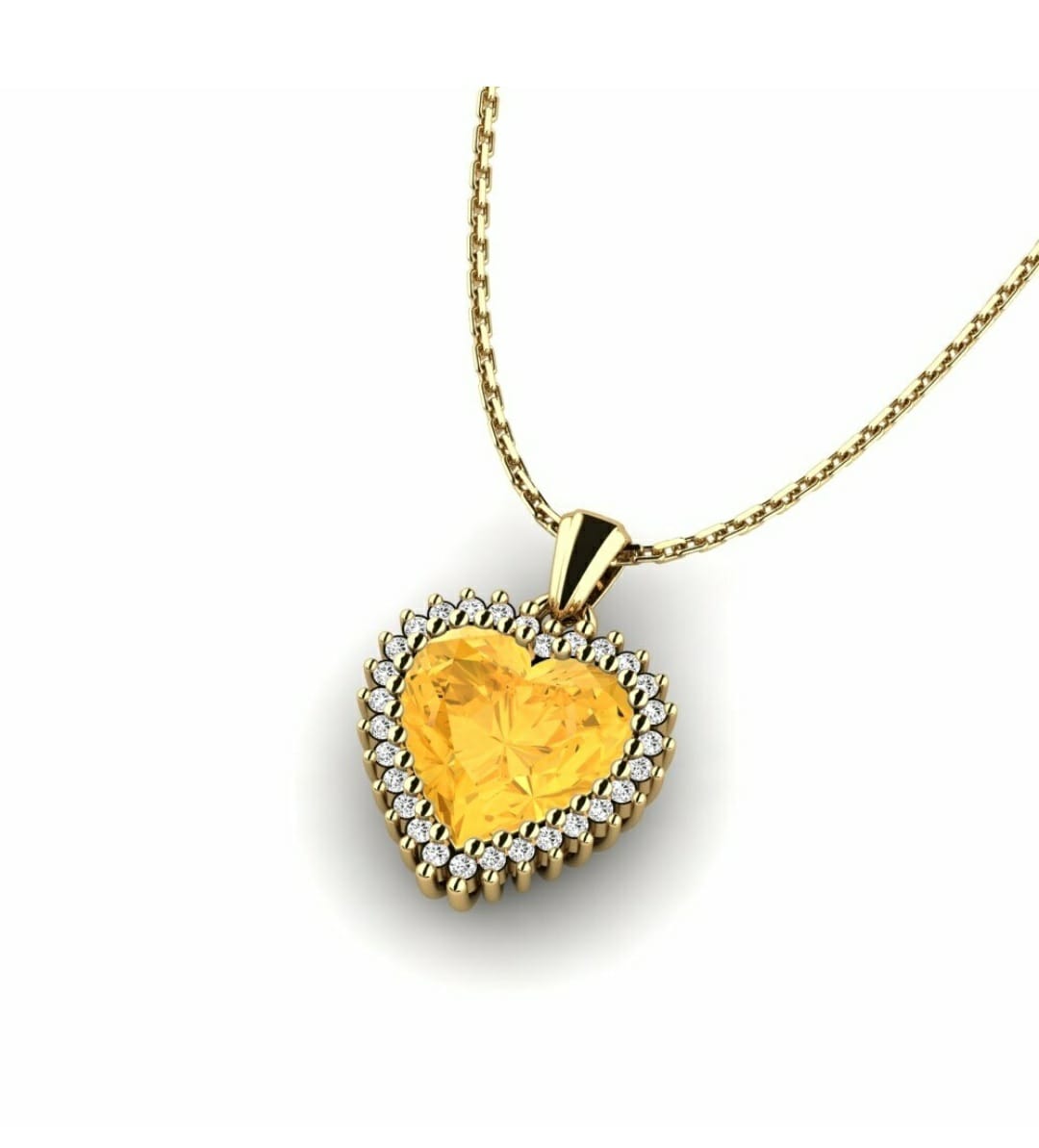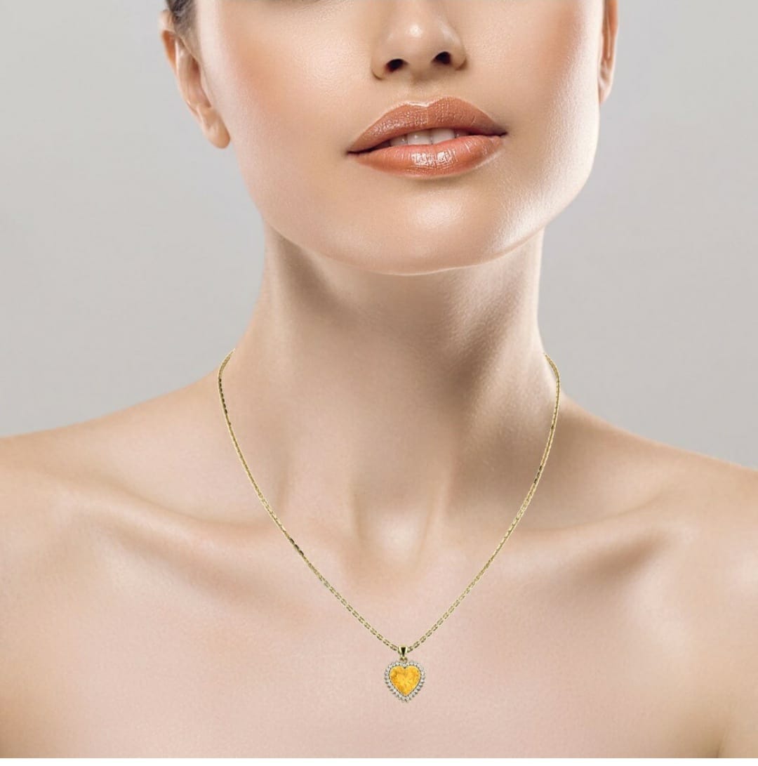 This stunning necklace showcases a heart-shaped yellow gemstone as its vibrant centerpiece, symbolizing warmth and affection. Encircled by a halo of brilliant white stones, the pendant is suspended on a sleek, gold chain that enhances its luxurious charm. The contrast between the golden hues and shimmering white stones creates a timeless piece that radiates both elegance and romantic appeal.