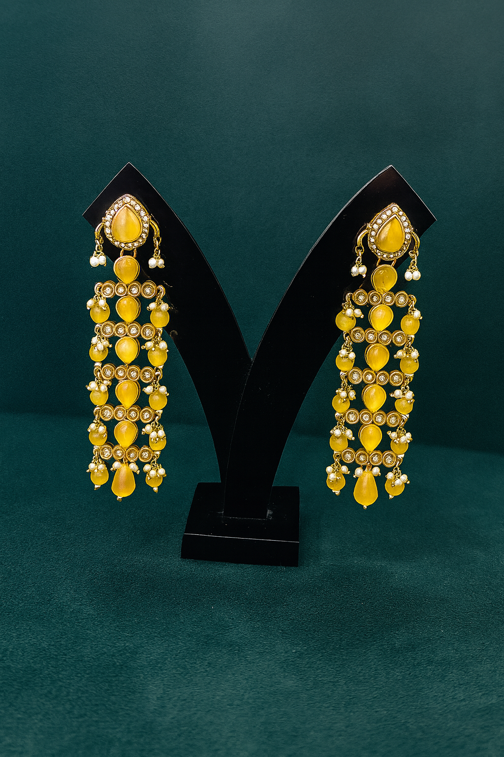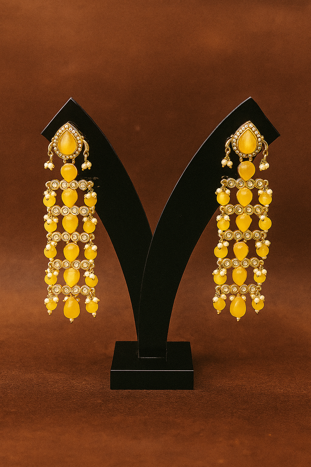 A stunning blend of traditional charm and contemporary elegance, these Yellow Kundan Cascade Long Earrings feature rich yellow stones paired with delicate pearl droplets. The long, tiered silhouette adds a graceful swing, making them perfect for festive and wedding looks. Set in a high-quality gold-tone alloy, each stone is intricately cut for a radiant finish. Lightweight yet statement-worthy, these earrings elevate your ethnic wardrobe instantly.
